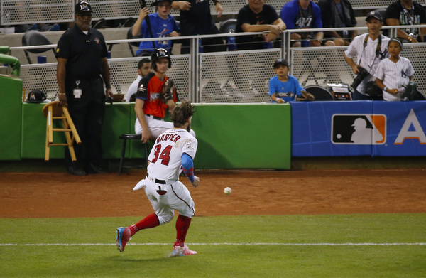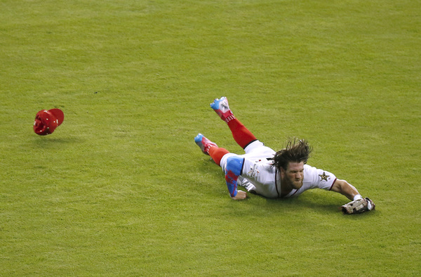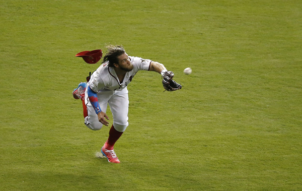 With the game devoid of any offense early on, Harper made a running catch to rob Salvador Perez of a two-out hit in the second inning, then fell forward to the grass as his cap flew off his head.