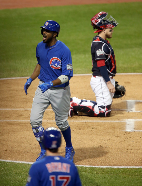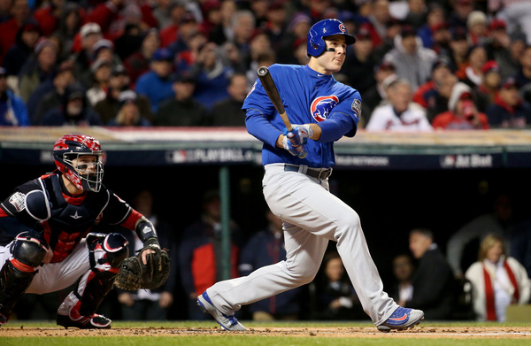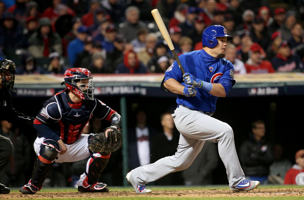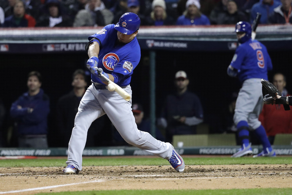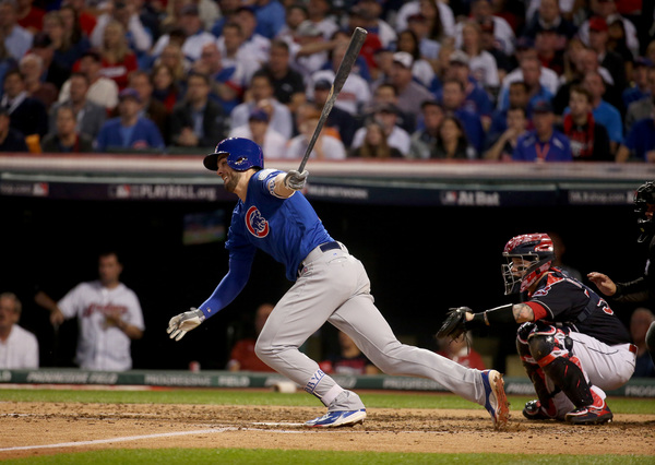 After the tarp was removed, Kyle Schwarber started the 10th with a single against righty Bryan Shaw and was replaced by pinch runner Albert Almora, who went to second on Kris Bryant's long fly out to center. Anthony Rizzo was intentionally walked and Ben Zobrist, hot all series, came through by hitting a 1-and-2 pitch to left to bring in Almora to make it 7-6. Miguel Montero's RBI single made it 8-6.