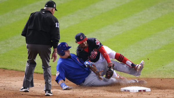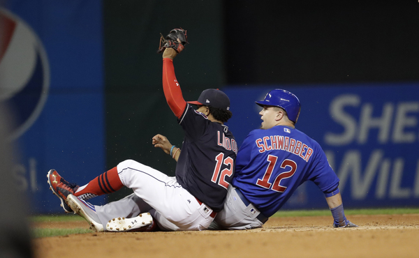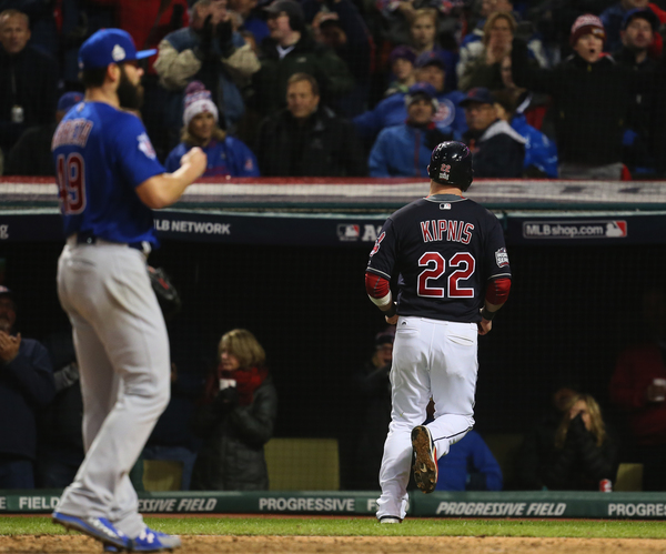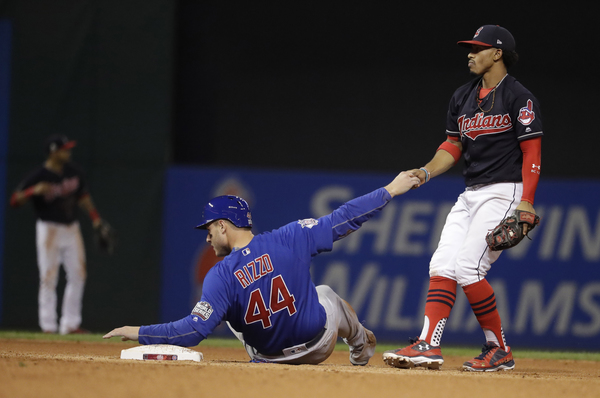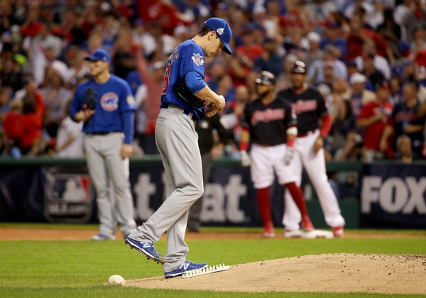 The Indians inserted some drama in the bottom of the fifth after the Cubs had taken a 5-1 lead in the top half on a Baez homer off Kluber and off Rizzo's RBI double off Miller. Carlos Santana walked with two outs and Maddon brought in Lester to face Jason Kipnis. The second baseman hit a dribbler to the right side of the mound and reached first, going to second on a wild throw by David Ross, Lester's personal catcher who entered along with the pitcher.