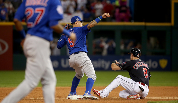 Cubs manager Joe Maddon brought on Chapman, who threw a career-long 22/3 innings in Game 5 and, somewhat controversially, was brought on in the seventh inning of Game 6 with a five-run lead. Guyer greeted Chapman with a double, which brought in Ramirez.