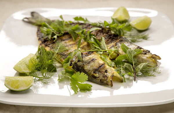 It's a simple, if dramatic, presentation: A butterflied whole branzino is marinated with turmeric, garlic and spicy Thai chiles just long enough for the flavors to infuse, 30 minutes or so. The fish is then quickly grilled until the skin is burnished and blistered and the interior is barely cooked through, and plated under an assortment of fragrant fresh herb sprigs _ mint, dill, laksa leaf _ and lime wedges. You could butterfly the fish yourself, or simply have your fishmonger do this for you at the market so it's ready to go.