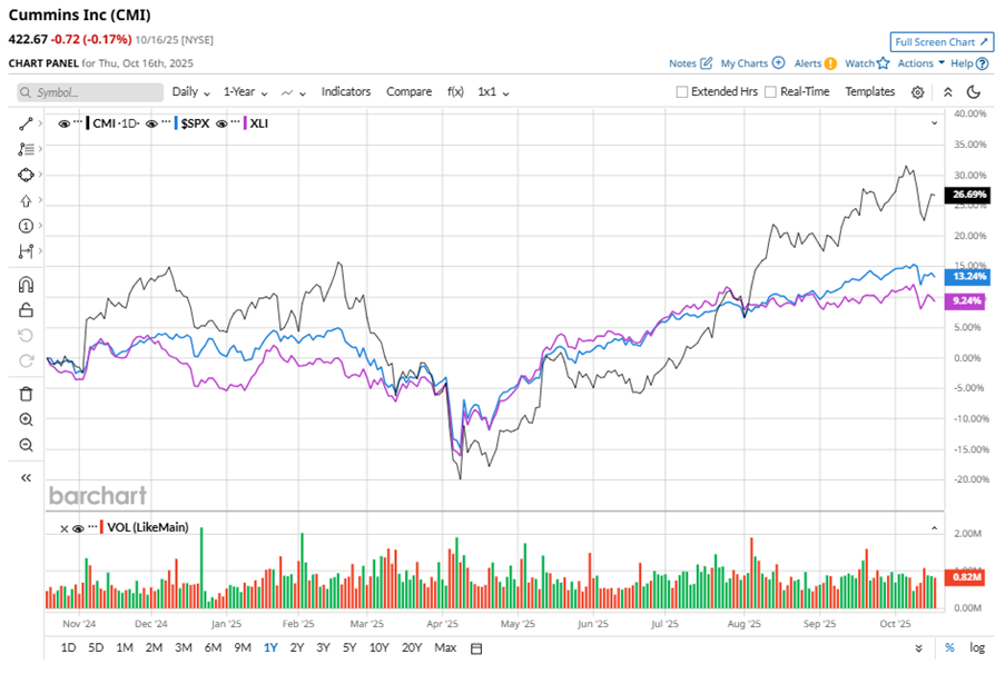 CMI stock has outperformed the S&P 500 Index’s ($SPX) 13.5% gains over the past 52 weeks, with shares up 26.6% during this period. Similarly, it outperformed the Industrial Select Sector SPDR Fund’s (XLI) 8.9% rise over the same time frame.