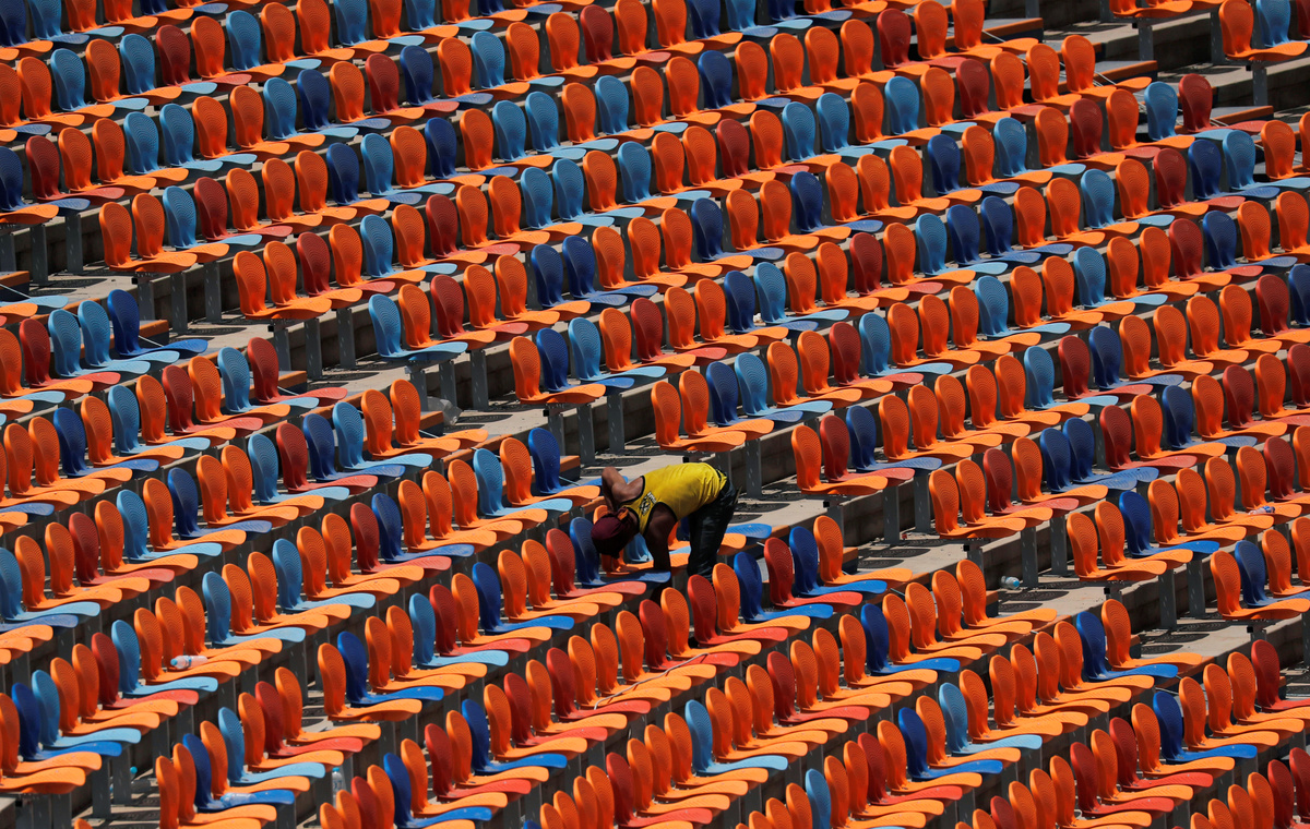 An employee fixes seats inside the Cairo International Stadium ahead of the Africa Cup of Nations opening soccer match between Egypt and Zimbabwe in Cairo, Egypt June 19, 2019. REUTERS/Amr Abdallah Dalsh