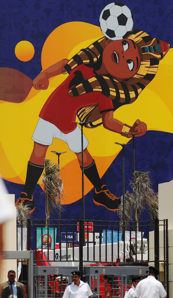 Police officers walk in front of a picture of Egyptian mascot for the Africa Cup of Nations, named "TUT" at the Cairo International Stadium ahead of the Africa Cup of Nations opening soccer match between Egypt and Zimbabwe in Cairo, Egypt June 19, 2019. REUTERS/Amr Abdallah Dalsh