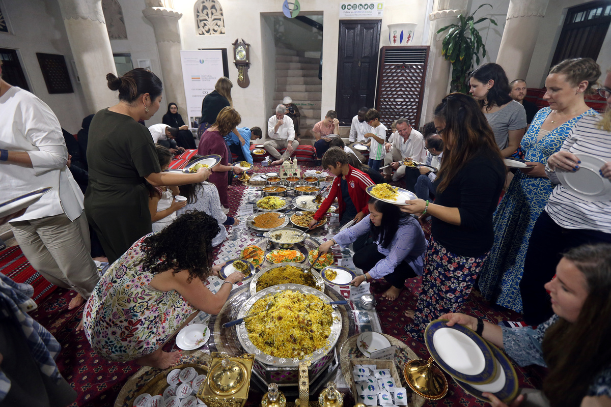 Visitors broke the day's fast with dates and water, before sampling Emirati cuisine, including biryani and machboos rice and meat dishes.