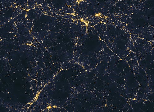 The shapes we see when we look at the cosmic web are created by the force of gravity, invisible dark matter (which we don’t know very much about at all) and changes caused by violent and powerful events, such as exploding stars called supernovae.