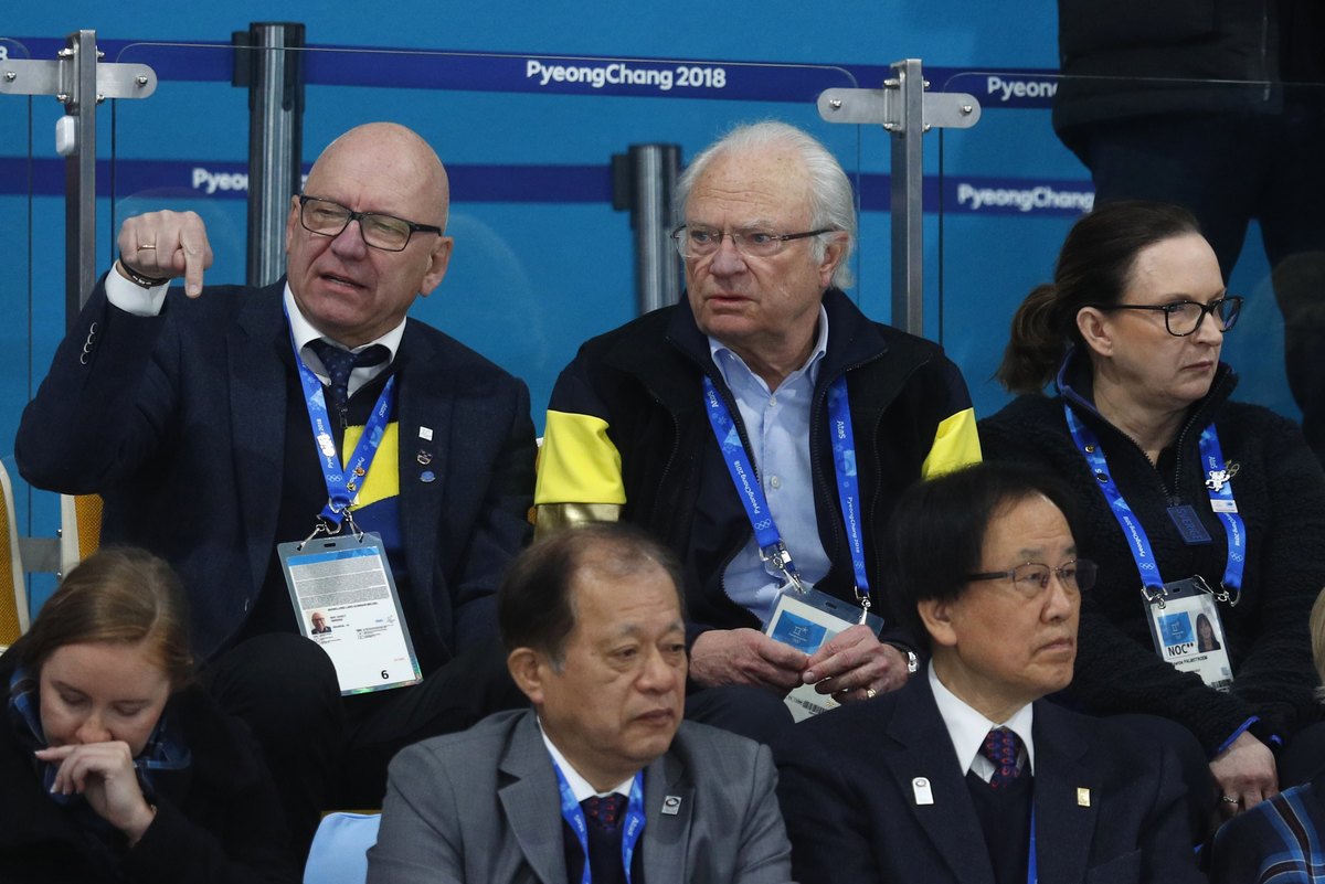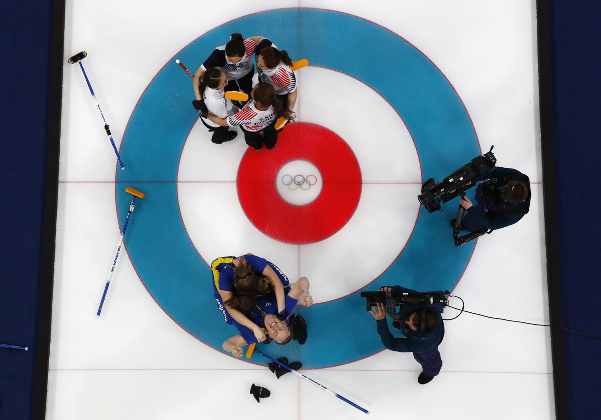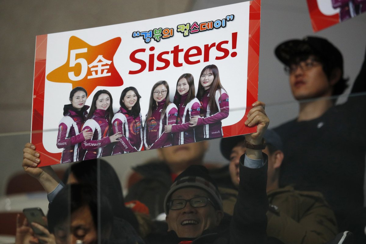 Curling - Pyeongchang 2018 Winter Olympics - Women's Final - Sweden v South Korea - Gangneung Curling Center - Gangneung, South Korea - February 25, 2018 - Sara McManus of Sweden and her teammates, Sofia Mabergs and Agnes Knochenhauer, react. REUTERS/Cathal McNaughtonCurling - Pyeongchang 2018 Winter Olympics - Women's Final - Sweden v South Korea - Gangneung Curling Center - Gangneung, South Korea - February 25, 2018 - A fan holds a sign with an image of South Korea's women's curling team. REUTERS/Phil NobleCurling - Pyeongchang 2018 Winter Olympics - Women's Final - Sweden v South Korea - Gangneung Curling Center - Gangneung, South Korea - February 25, 2018 - Anna Hasselborg of Sweden competes. REUTERS/Phil NobleCurling - Pyeongchang 2018 Winter Olympics - Women's Final - Sweden v South Korea - Gangneung Curling Center - Gangneung, South Korea - February 25, 2018 - Fans of South Korea watch the match. REUTERS/Phil NobleCurling - Pyeongchang 2018 Winter Olympics - Women's Final - Sweden v South Korea - Gangneung Curling Center - Gangneung, South Korea - February 25, 2018 - Sweden's King Carl Gustav (rear C) watches the match. REUTERS/Phil Noble