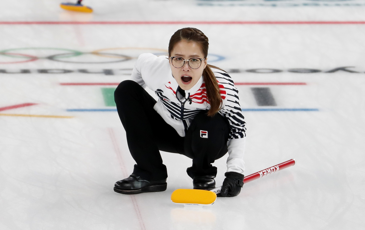 Kim Seon-yeong of South Korea competes in the women's curling final against Sweden. REUTERS/Cathal Mcnaughton