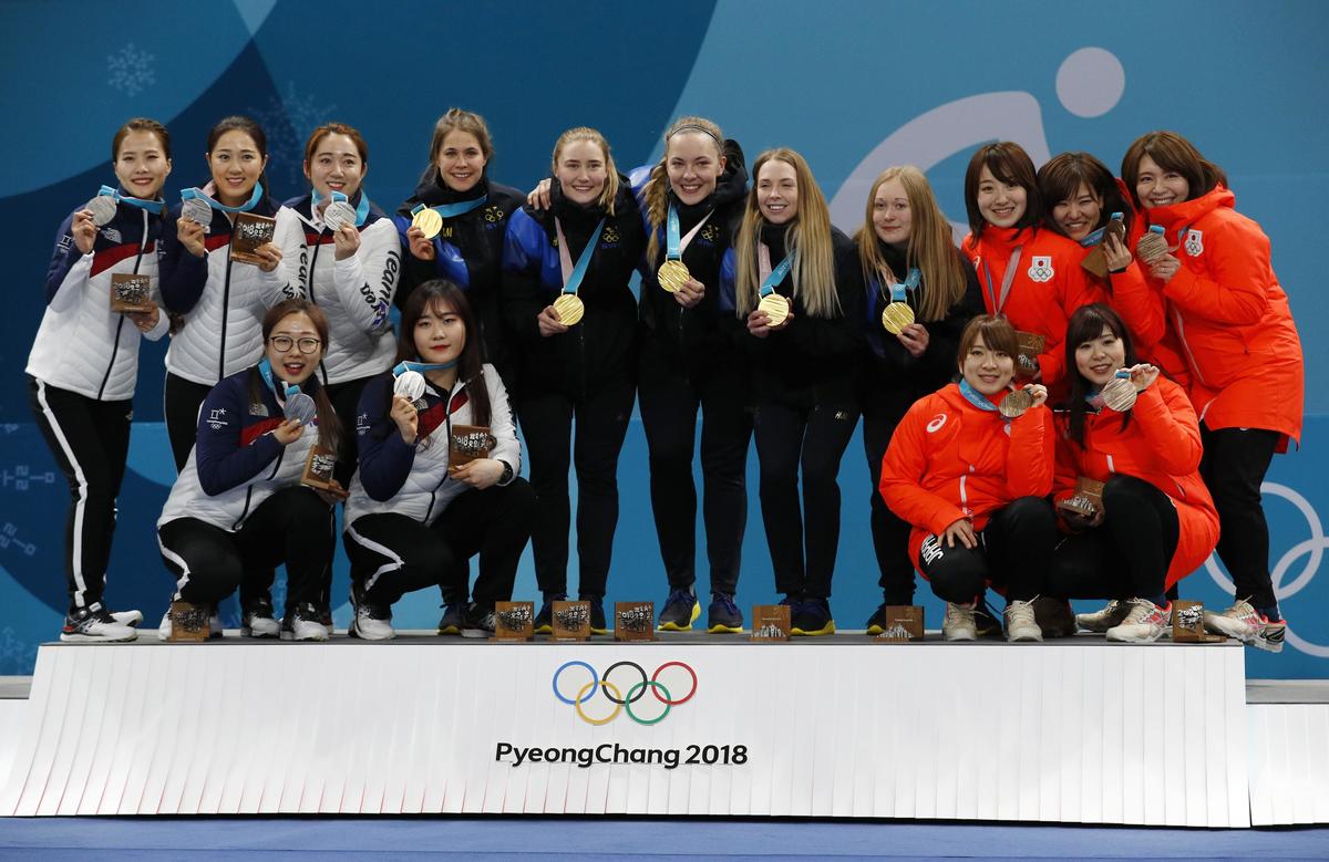 Curling - Pyeongchang 2018 Winter Olympics - Women's Final - Sweden v South Korea - Gangneung Curling Center - Gangneung, South Korea - February 25, 2018 - Silver medallists from South Korea, gold medallists from Sweden and bronze medallists from Japan pose during the victory ceremony. REUTERS/Phil Noble