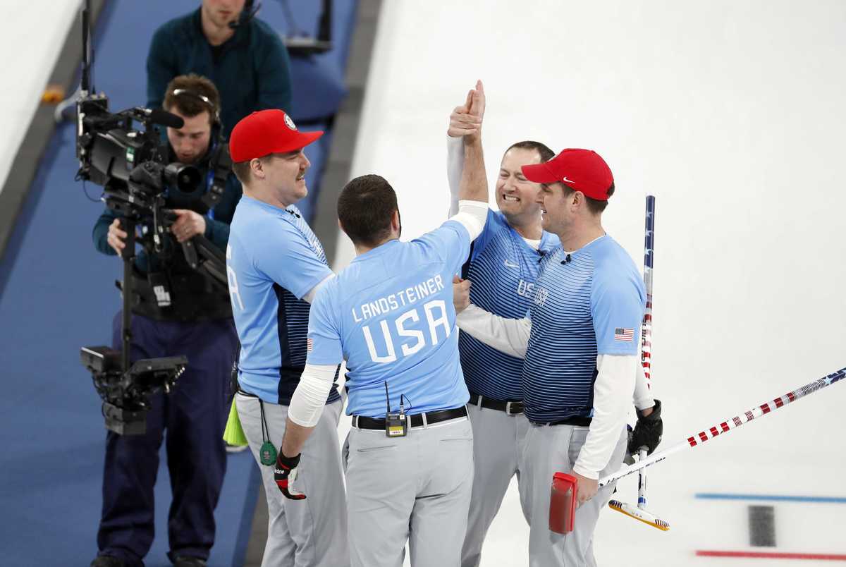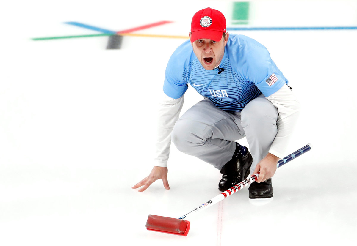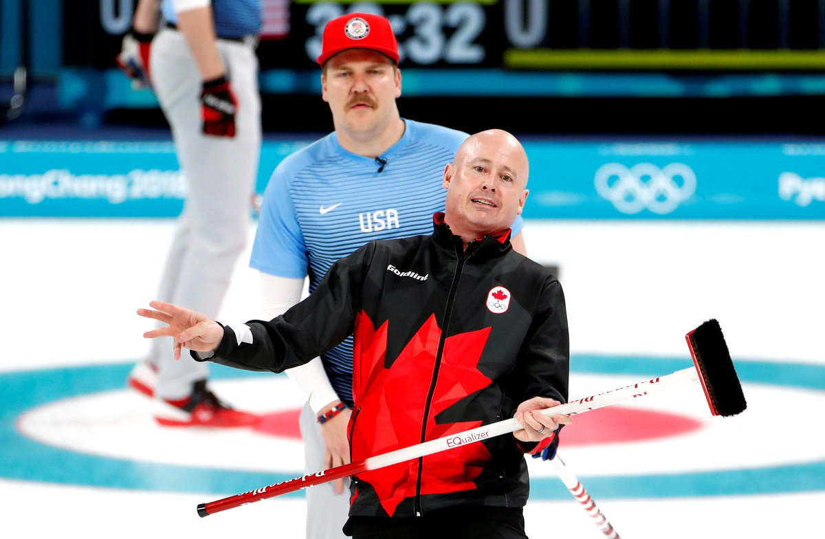 Curling - Pyeongchang 2018 Winter Olympics - Men's Semi-final - Canada v U.S. - Gangneung Curling Center - Gangneung, South Korea - February 22, 2018 - Skip John Shuster of the U.S. shouts to his team mates. REUTERS/Cathal McNaughtonCurling - Pyeongchang 2018 Winter Olympics - Men's Semi-final - Canada v U.S. - Gangneung Curling Center - Gangneung, South Korea - February 22, 2018 - Lead Ben Hebert and second Brent Laing of Canada react during the game. REUTERS/Phil NobleCurling - Pyeongchang 2018 Winter Olympics - Men's Semi-final - Canada v U.S. - Gangneung Curling Center - Gangneung, South Korea - February 22, 2018 - Vice-skip Tyler George and skip John Shuster of the U.S. gesture during the game. REUTERS/Phil NobleCurling - Pyeongchang 2018 Winter Olympics - Men's Semi-final - Canada v U.S. - Gangneung Curling Center - Gangneung, South Korea - February 22, 2018 - Skip John Shuster of the U.S. reacts after winning the game. REUTERS/Phil Noble Curling - Pyeongchang 2018 Winter Olympics - Men's Semi-final - Canada v U.S. - Gangneung Curling Center - Gangneung, South Korea - February 22, 2018 - Skip John Shuster of the U.S. and vice-skip Marc Kennedy of Canada shake hands after the game. REUTERS/Phil NobleCurling - Pyeongchang 2018 Winter Olympics - Men's Semi-final - Canada v U.S. - Gangneung Curling Center - Gangneung, South Korea - February 22, 2018 - Team U.S. celebrate after winning the game. REUTERS/Cathal McNaughton