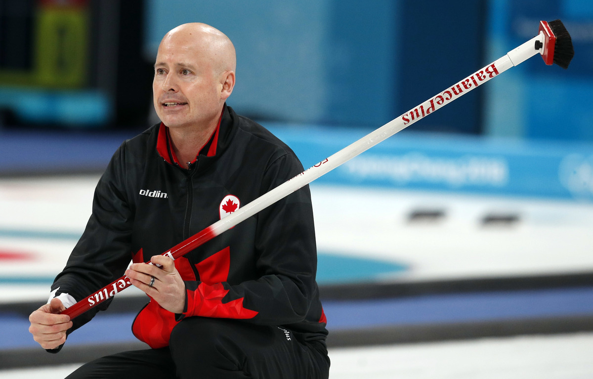 Curling - Pyeongchang 2018 Winter Olympics - Men's Semi-final - Canada v U.S. - Gangneung Curling Center - Gangneung, South Korea - February 22, 2018 - Skip Kevin Koe of Canada watches as lead Ben Hebert of Canada sweeps. REUTERS/Cathal McNaughton