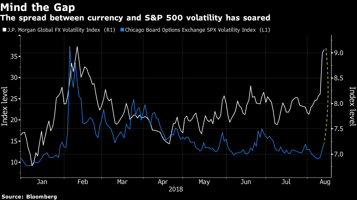 As Turkey’s lira crisis batters emerging-market currencies while trade tensions intensify and the yuan continues to weaken, a JPMorgan Chase & Co. index of exchange-rate volatility just experienced its biggest surge since 2016’s Brexit vote. The gauge now sits at its highest since February.