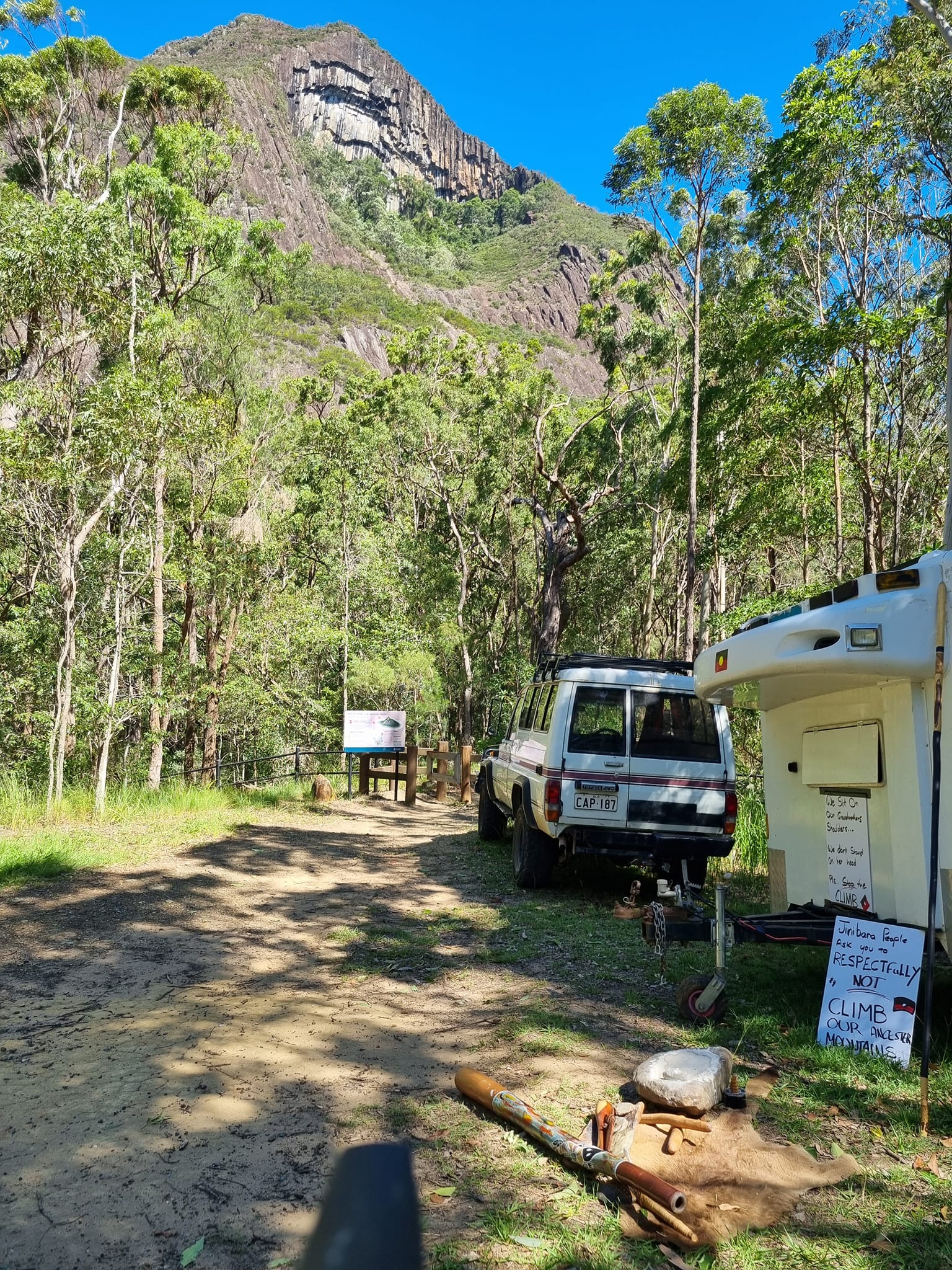 Jinibara songman BJ Murphy has been camping at the foot of Mount Beerwah for the past two nights to educate visitors on the cultural harm caused by hiking.