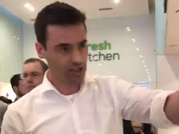 It shows a middle-aged, athletic-looking white man berating both customers and a manager at a restaurant called Fresh Kitchen.