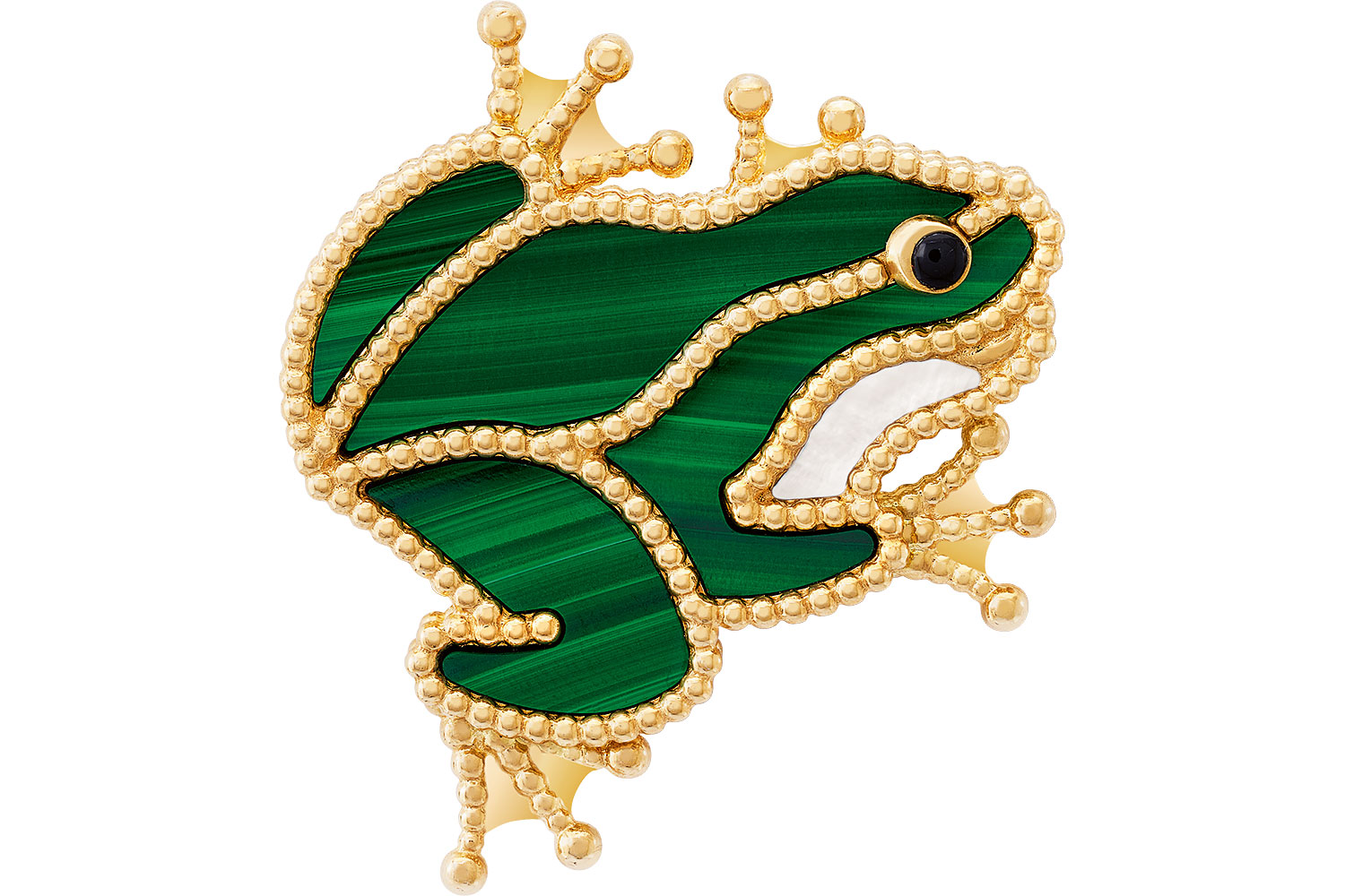 Bordered by golden beads, the new clips Teddy Bear, Fox, Dachshund, Bichon Frisé and Frog feature different combinations of stone and mother-of-pearl.