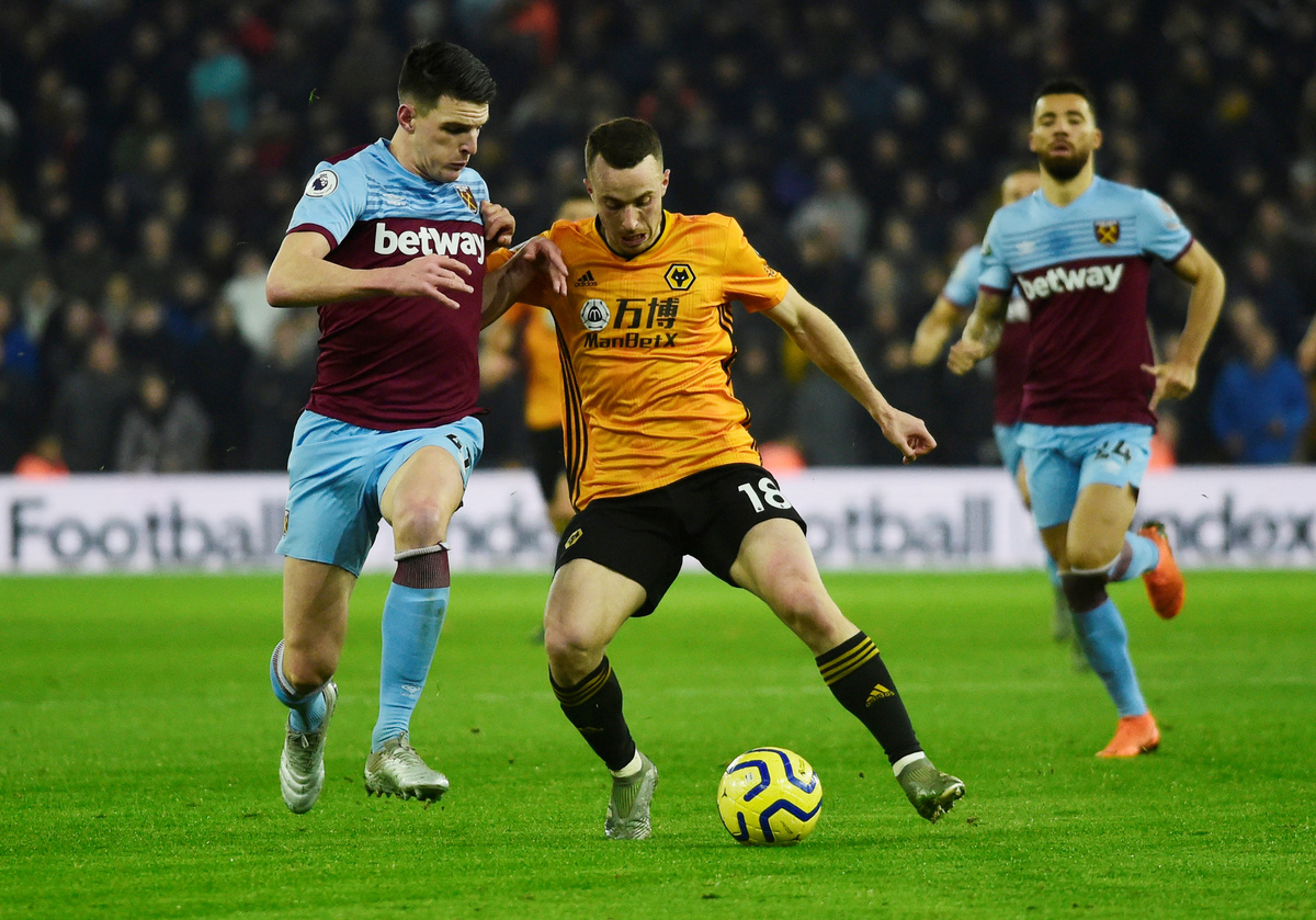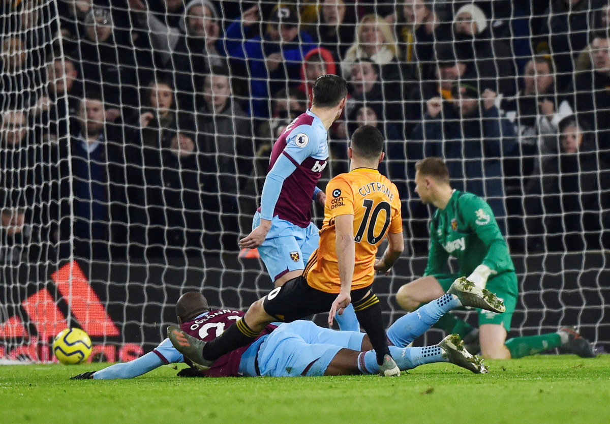 Soccer Football - Premier League - Wolverhampton Wanderers v West Ham United - Molineux Stadium, Wolverhampton, Britain - December 4, 2019 Wolverhampton Wanderers' Adama Traore in action with West Ham United's Aaron Cresswell REUTERS/Rebecca Naden Soccer Football - Premier League - Wolverhampton Wanderers v West Ham United - Molineux Stadium, Wolverhampton, Britain - December 4, 2019 Wolverhampton Wanderers' Diogo Jota in action with West Ham United's Declan Rice REUTERS/Rebecca Naden Soccer Football - Premier League - Wolverhampton Wanderers v West Ham United - Molineux Stadium, Wolverhampton, Britain - December 4, 2019 Wolverhampton Wanderers' Leander Dendoncker celebrates scoring their first goal Action Images via Reuters/Matthew Childs Soccer Football - Premier League - Wolverhampton Wanderers v West Ham United - Molineux Stadium, Wolverhampton, Britain - December 4, 2019 Wolverhampton Wanderers' Leander Dendoncker celebrates scoring their first goal REUTERS/Rebecca Naden Soccer Football - Premier League - Wolverhampton Wanderers v West Ham United - Molineux Stadium, Wolverhampton, Britain - December 4, 2019 Wolverhampton Wanderers' Leander Dendoncker scores their first goal REUTERS/Rebecca Naden Soccer Football - Premier League - Wolverhampton Wanderers v West Ham United - Molineux Stadium, Wolverhampton, Britain - December 4, 2019 West Ham United's Pablo Fornals in action with Wolverhampton Wanderers' Diogo Jota Action Images via Reuters/Matthew Childs Soccer Football - Premier League - Wolverhampton Wanderers v West Ham United - Molineux Stadium, Wolverhampton, Britain - December 4, 2019 West Ham United manager Manuel Pellegrini shakes hands with West Ham United's Albian Ajeti after the match Action Images via Reuters/Matthew Childs