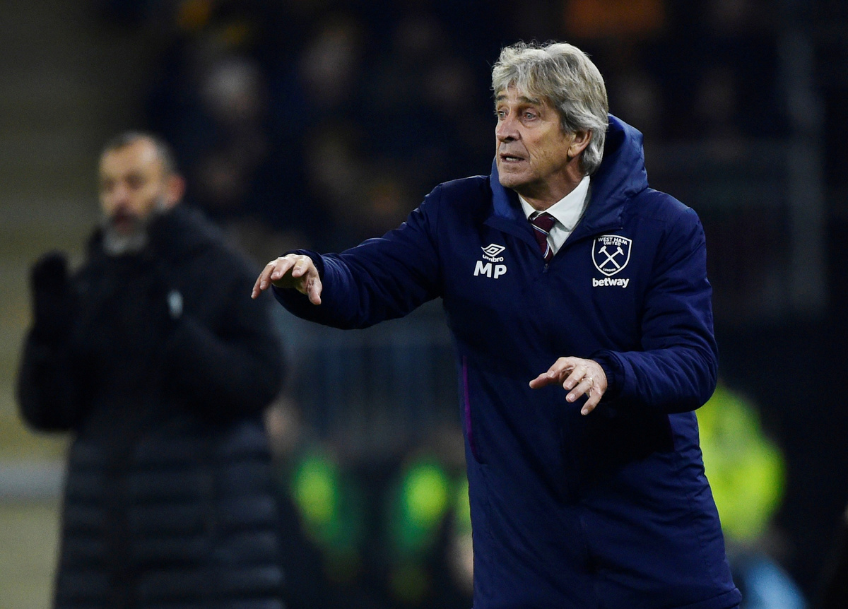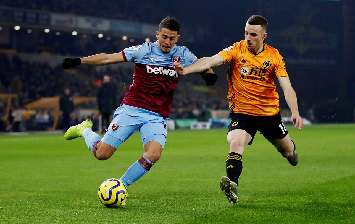 Soccer Football - Premier League - Wolverhampton Wanderers v West Ham United - Molineux Stadium, Wolverhampton, Britain - December 4, 2019 Wolverhampton Wanderers' Adama Traore in action with West Ham United's Aaron Cresswell Action Images via Reuters/Matthew Childs Soccer Football - Premier League - Wolverhampton Wanderers v West Ham United - Molineux Stadium, Wolverhampton, Britain - December 4, 2019 West Ham United manager Manuel Pellegrini reacts REUTERS/Rebecca Naden