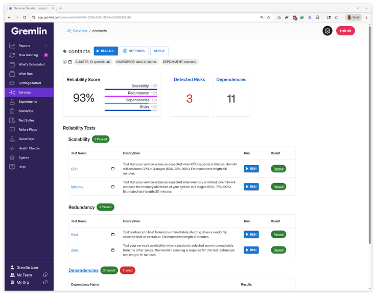 Kubernetes services are automatically discovered within Gremlin, powered by Dynatrace's AI-driven observability and topology mapping. Health checks are then applied to Kubernetes' objects, allowing organizations to efficiently implement standardized reliability testing and gain deeper insights into their environments.