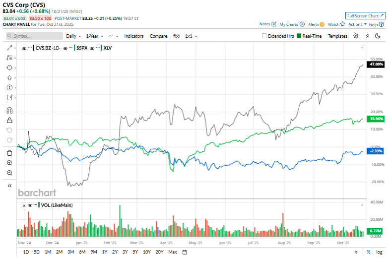 CVS has gained 42.8% over the past 52 weeks, outperforming the S&P 500 Index's ($SPX) 15.1% return and the Health Care Select Sector SPDR Fund’s (XLV) 4.1% loss over the same period.