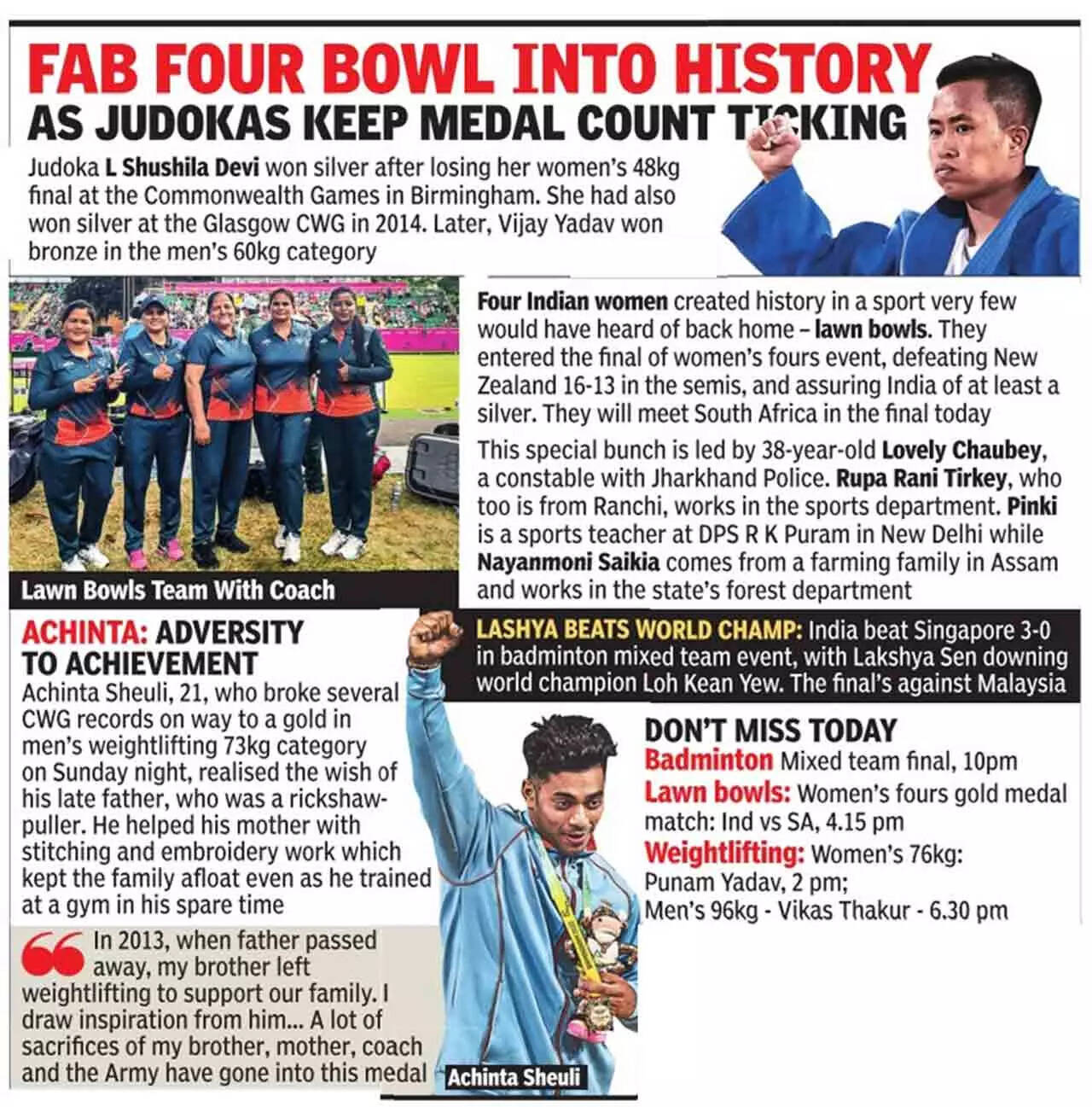 So, it readily qualified as the "feel good" news of the day. India's women's fours lawn bowls team made the final beating New Zealand 16-13 and assuring the country its first-ever medal in the sport. What made the win even more significant was the huge upset the Indian women caused, defeating a country that has 40 medals in the sport and is ranked among the five most successful lawn bowls teams ever.
