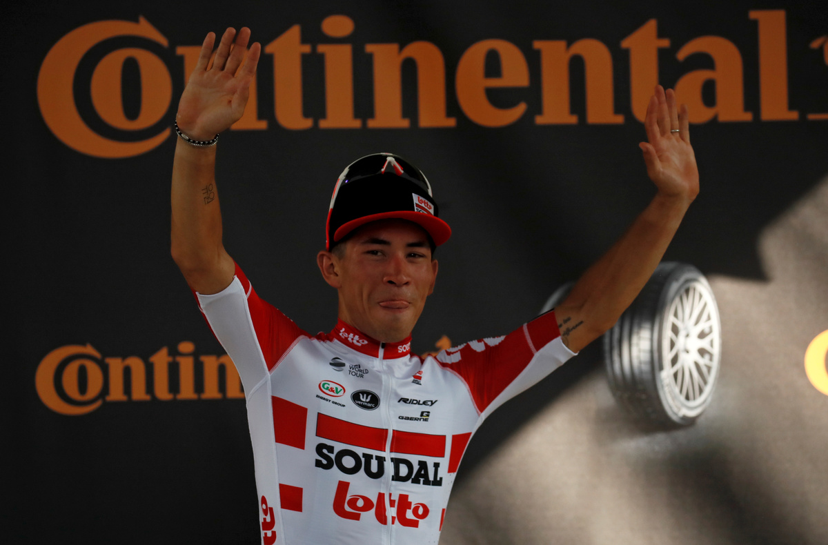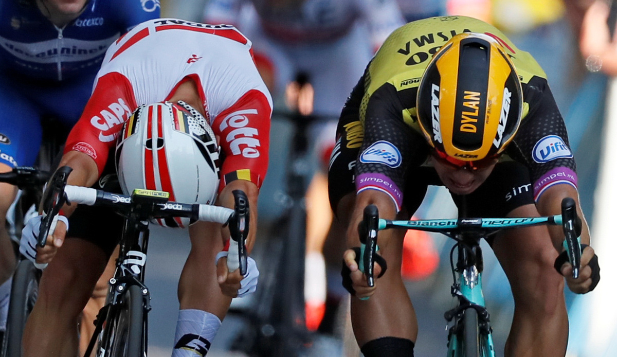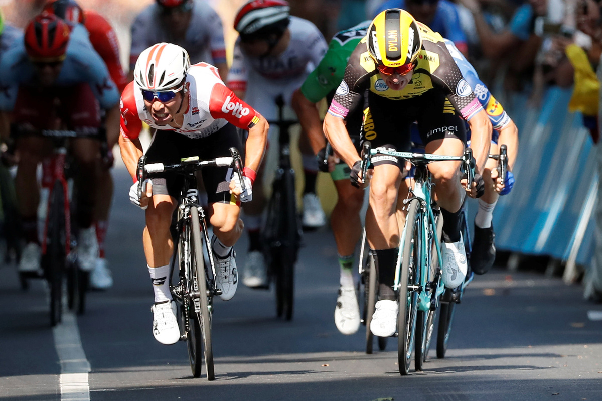 The Lotto Soudal rider surged past Groenewegen in a mass sprint to prevail by a few centimetres, with Italian Elia Viviani taking third place.