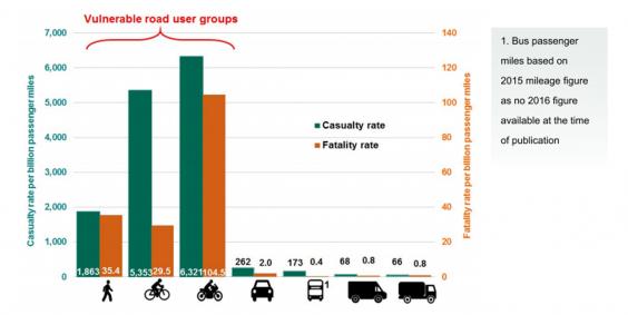 That compares with just 262 accidents and 2 deaths per billion miles for car drivers.