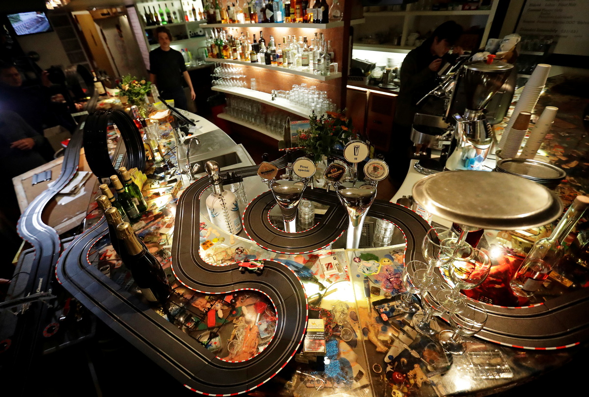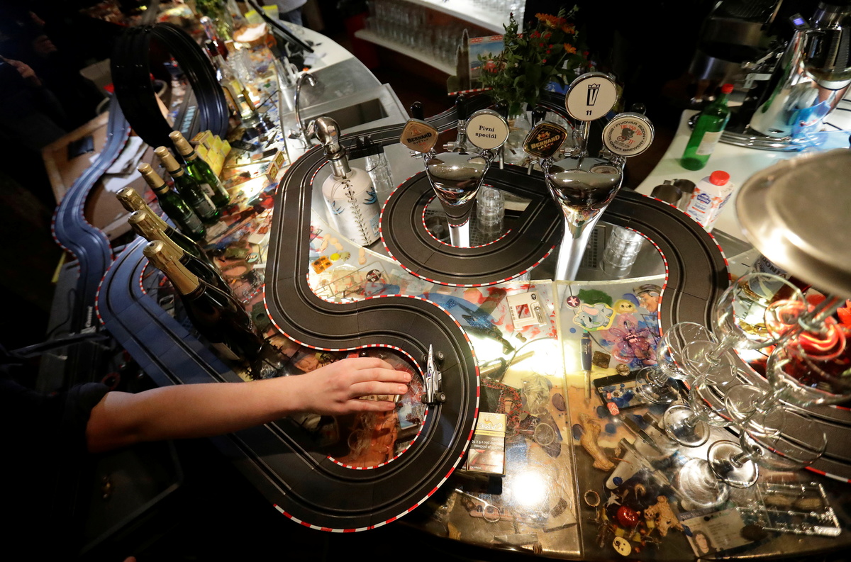 A Czech cafe has turned its bar area into a model electric car track for bartenders and staff to pass the time while the country's pubs and restaurants are shuttered to the public to curb a rising tide of coronavirus infections.