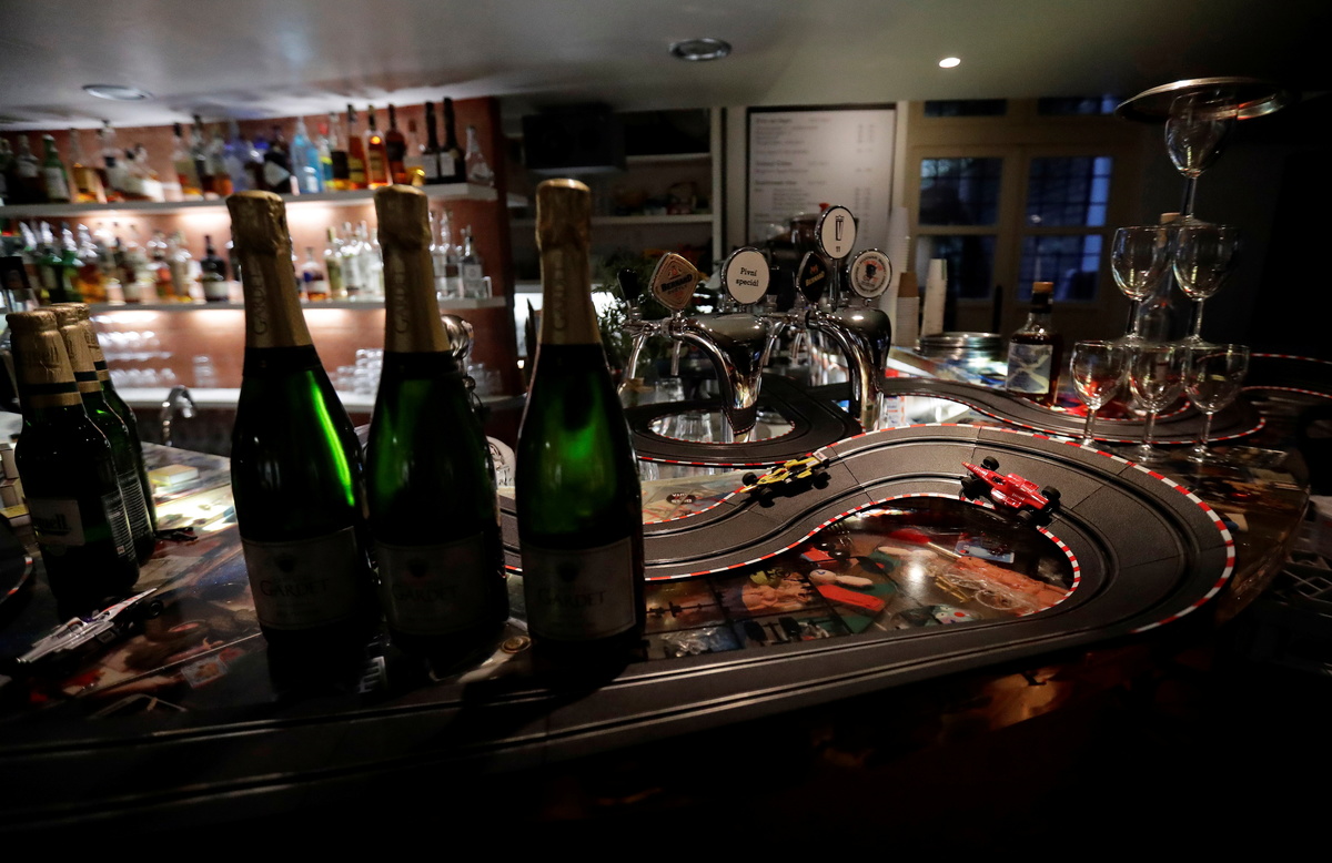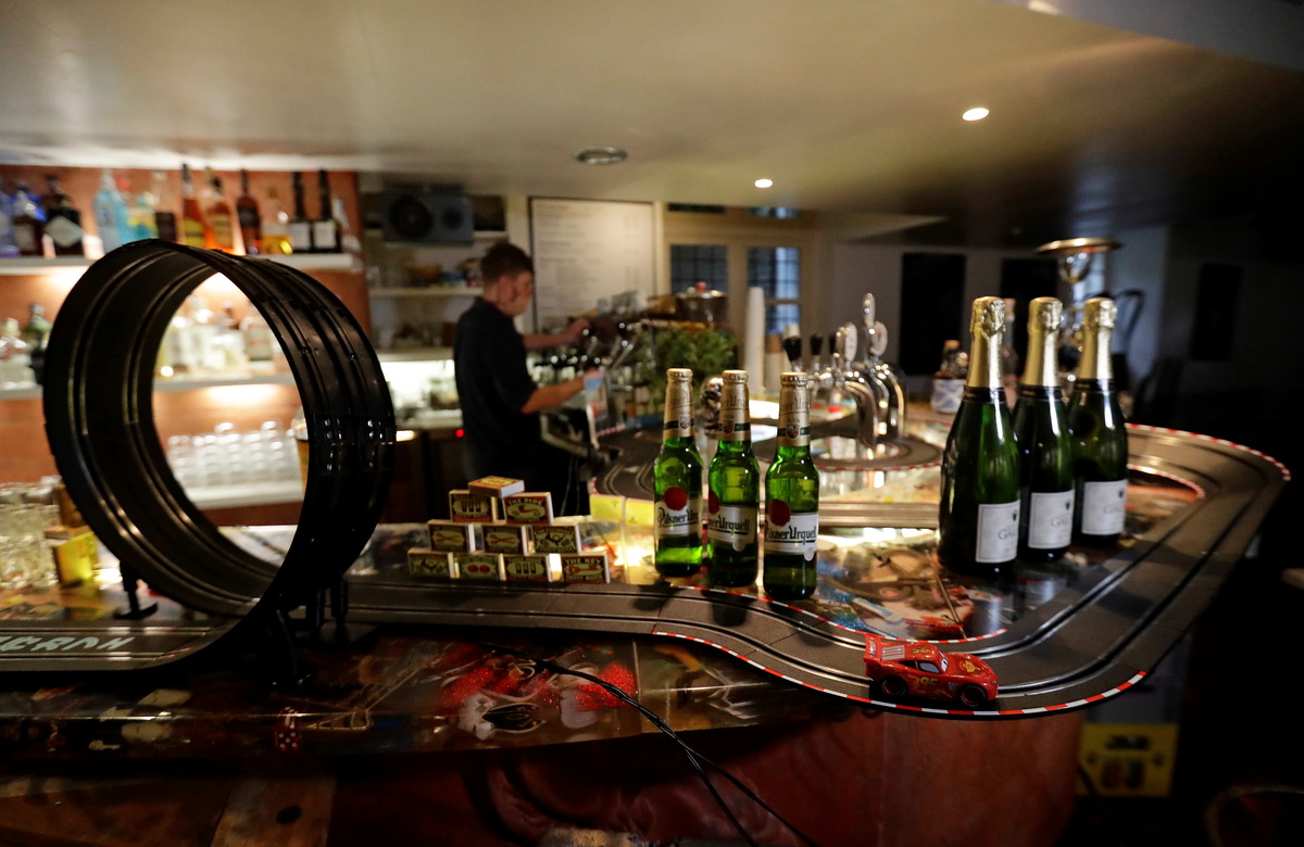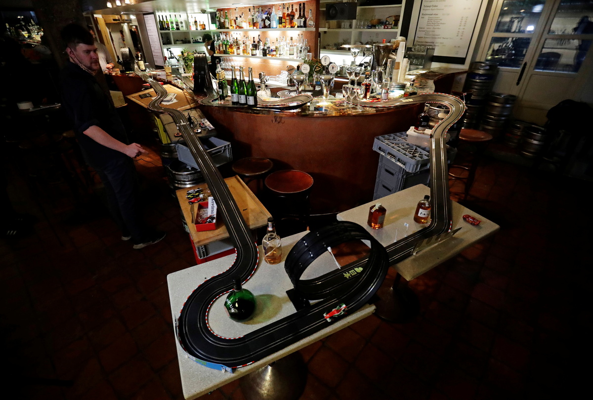 An electric car track is seen installed inside a cafe bar, as the Czech government shut all restaurants for two weeks to slow down the spread of the coronavirus disease (COVID-19), in Prague, Czech Republic, October 16, 2020. REUTERS/David W CernyA bartender waiting for take away orders plays with an electric car track inside a cafe bar, as the Czech government shut all restaurants for two weeks to slow down the spread of the coronavirus disease (COVID-19), in Prague, Czech Republic, October 16, 2020. REUTERS/David W Cerny
