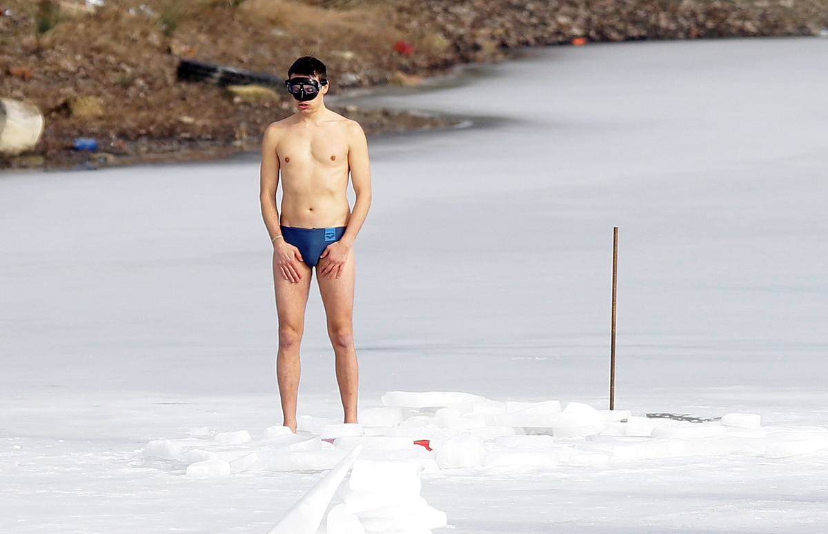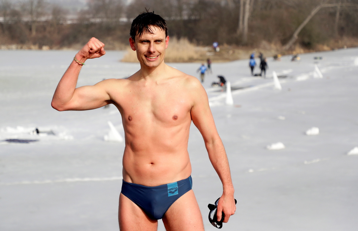 Czech free-diver David Vencl reacts after breaking the new world record in under-ice swimming in a lake at a former quarry in the village of Lahost near the city of Teplice, Czech Republic, February 23, 2021. Vencl swam 80,9 metres under ice on Tuesday without using any support gear, wearing just a swimsuit. REUTERS/David W Cerny