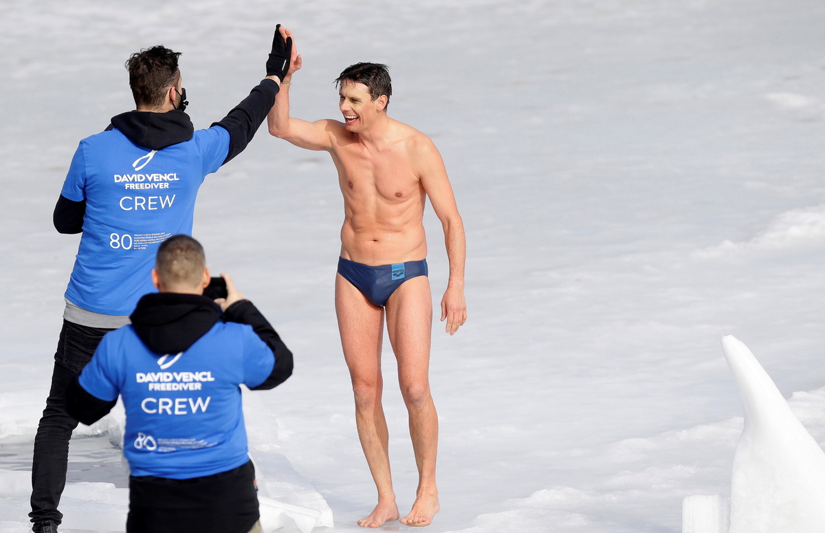 Czech free-diver David Vencl swam nearly 81 metres (265.75 ft) beneath the ice on Tuesday, breaking the world record after braving the freezing water wearing only a swimsuit.