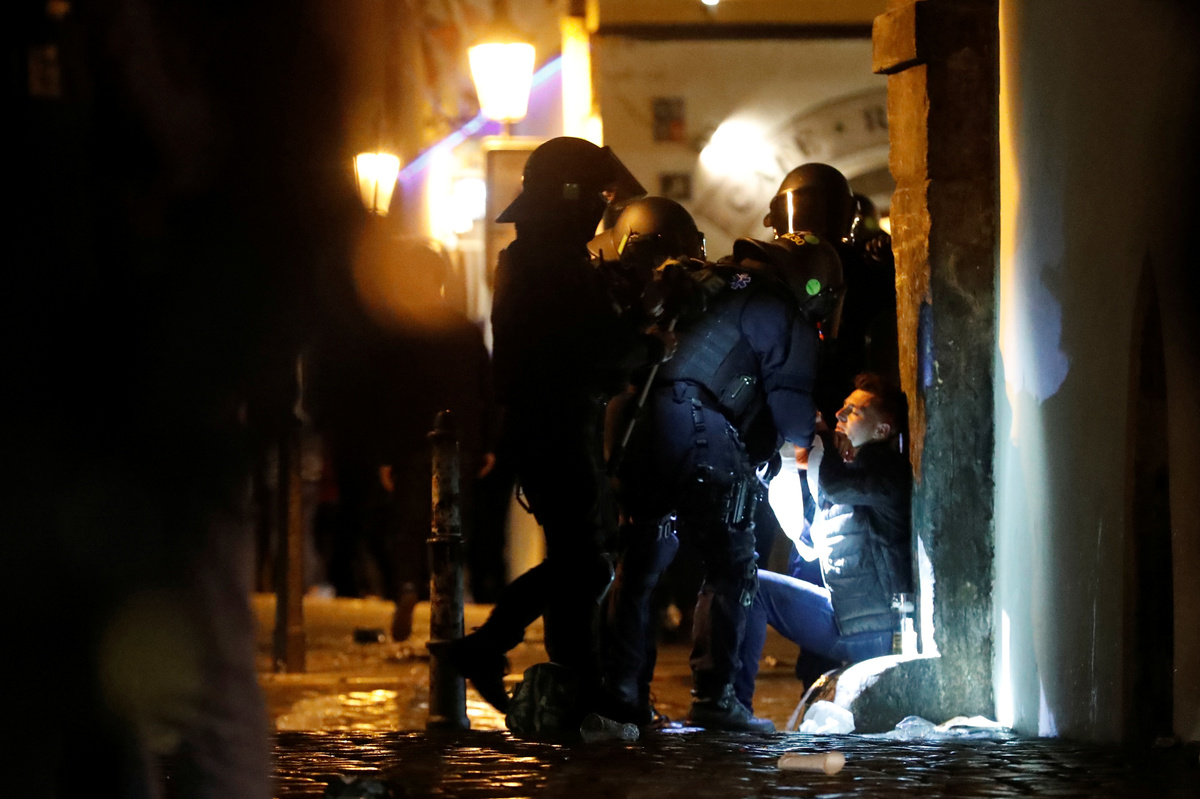 The authorities said they used force to detain a number of what they called "football hooligans", including 14 foreigners. Pictures showed broken glass shattered over cobblestone streets in the area which is normally filled with tourists.