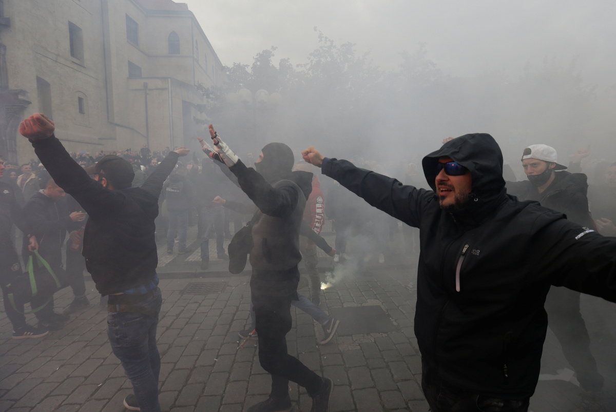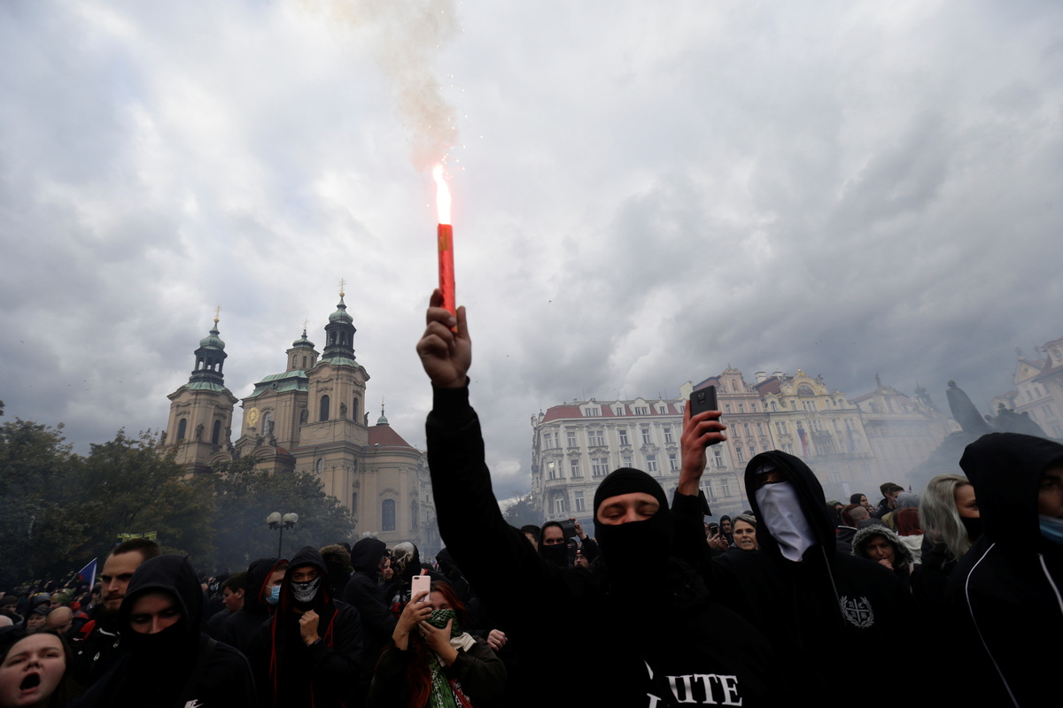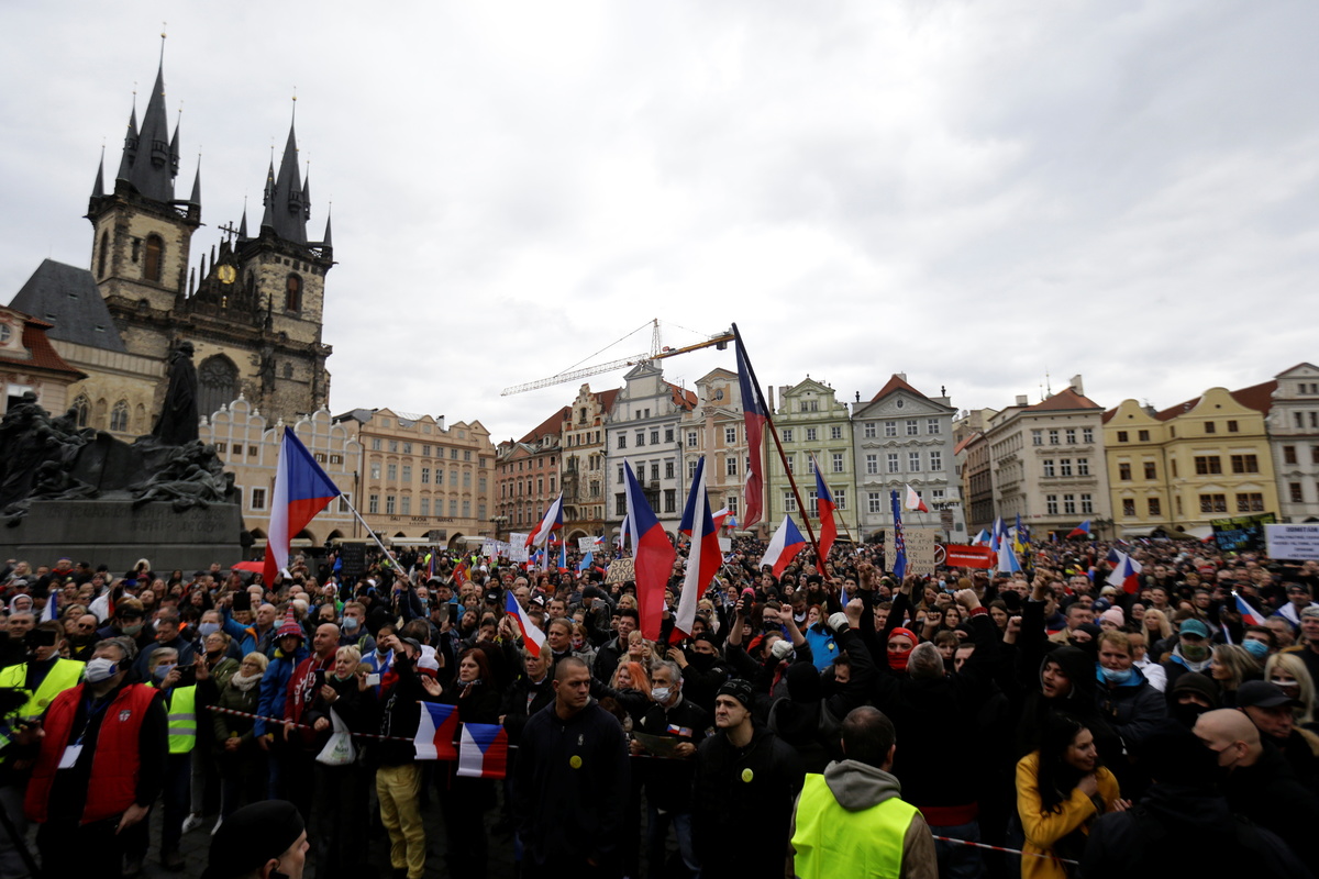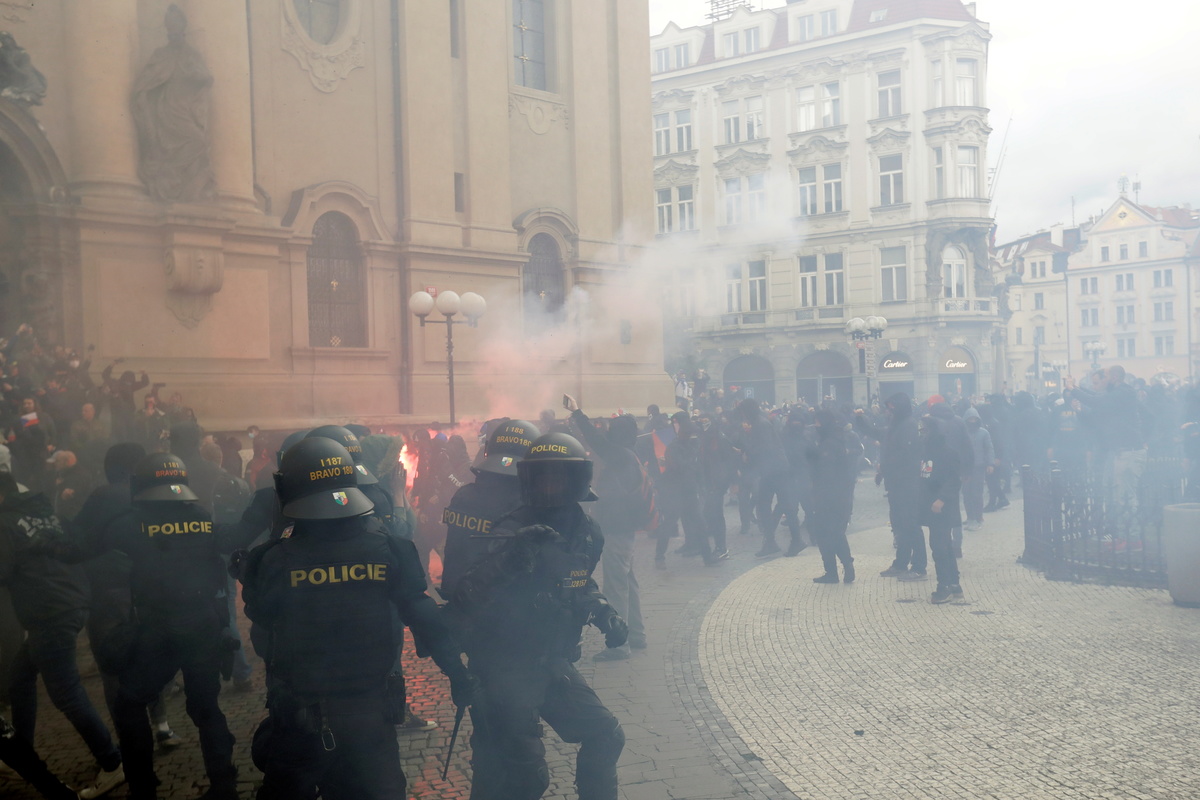 In Prague, more than 2,000 sports fans according to city hall estimates, including militant soccer supporters' groups known as ultras, protested against the coronavirus measures, defying restrictions on gatherings.