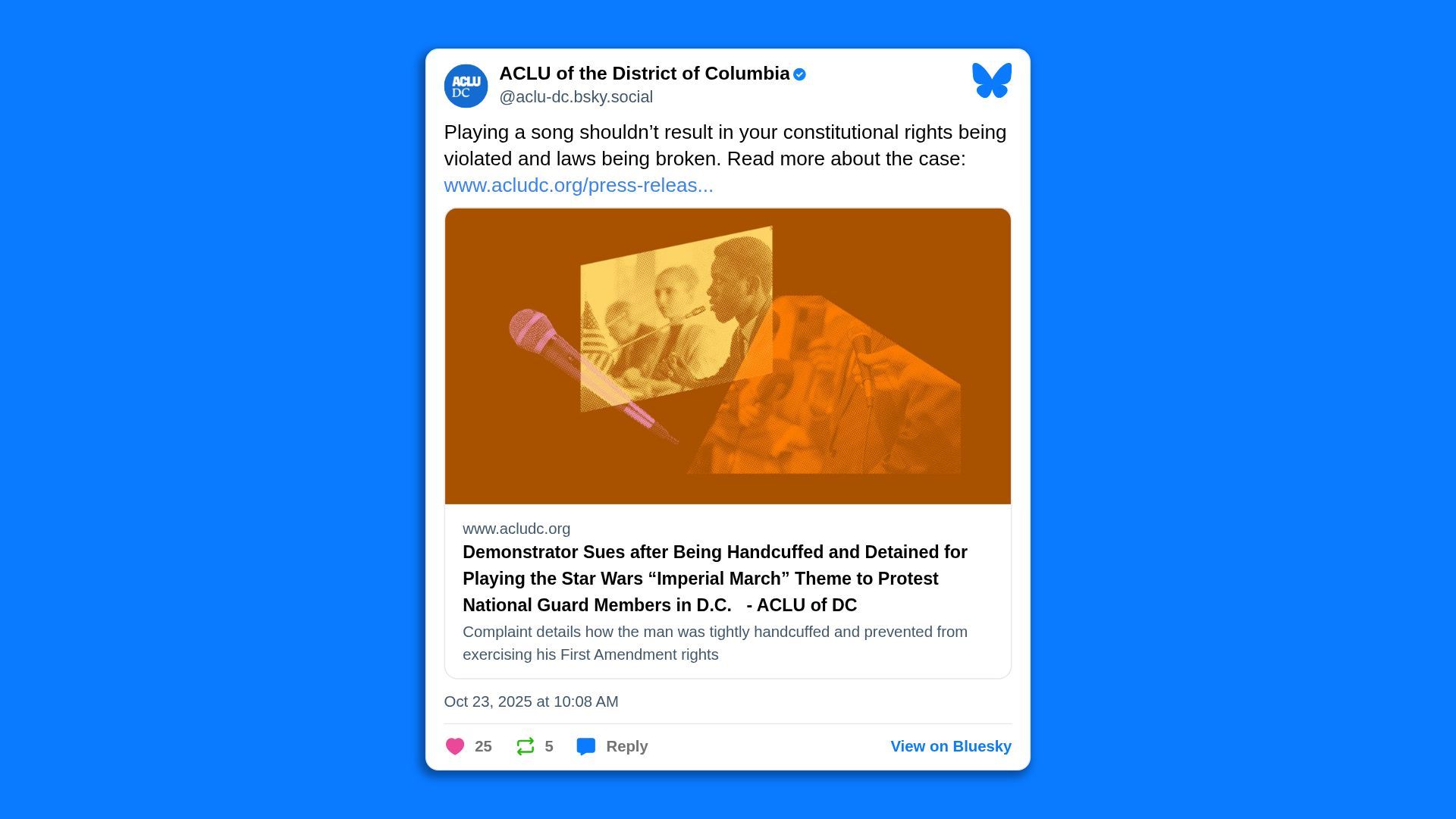A D.C. man filed a lawsuit Thursday claiming he was detained for playing Darth Vader's theme from the "Star Wars" while protesting National Guard troops patrolling the city during President Trump's crime crackdown.
