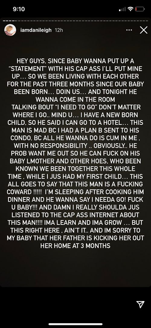Shortly after DaBaby’s lengthy message likening her to a crazed ex-lover, DaniLeigh told her side of the story. On a series of posts on her Instagram Stories, the singer accused DaBaby of abruptly waking her out of her sleep just to demand her to and their three-month-old child vacate his home after the pair had been living together since the birth of their daughter. DaniLeigh alleges he also suggested she and their child stay at a hotel. Apparently, the impetus of DaBaby’s supposed tirade was DaniLeigh having Plan B emergency contraceptives sent to his condo. From DaniLeigh’s point of view, DaBaby wanted to interfere with her bodily autonomy and decided if he couldn’t, she no longer needed to be around him.