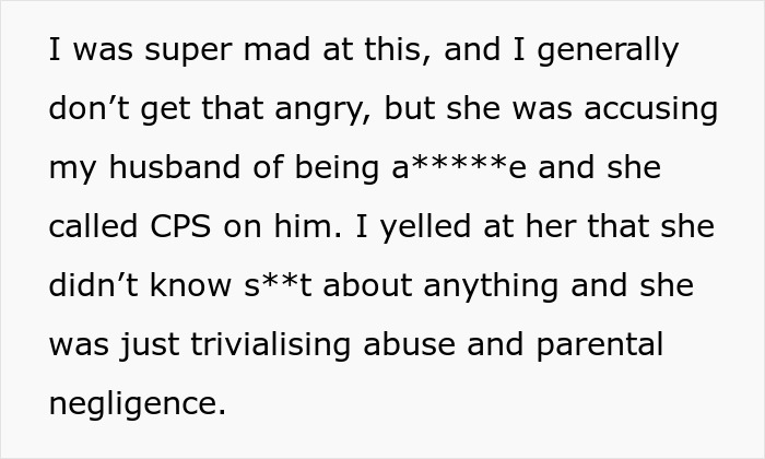 Later, after some digging, the OP learned that the neighbor did in fact make the report. She confessed and accused the husband of being neglectful and almost mistreating their son. That’s when the OP snapped. She yelled, she cursed, and she gave the neighbor a verbal smackdown for trivializing real parental neglect. So, was she totally out of line, or was she defending her family against a major overstep?