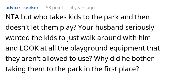 The OP (original poster), a mom of two, was swamped with work one day, so her husband took the kiddos, 6-year-old Jake and 3-year-old Amy, to the park solo. Classic parenting tag-team scenario. Now, any parent who’s braved the park alone knows it’s basically Survivor with little sneakers. One kid wants to swing, the other is eating leaves, and someone’s always falling.