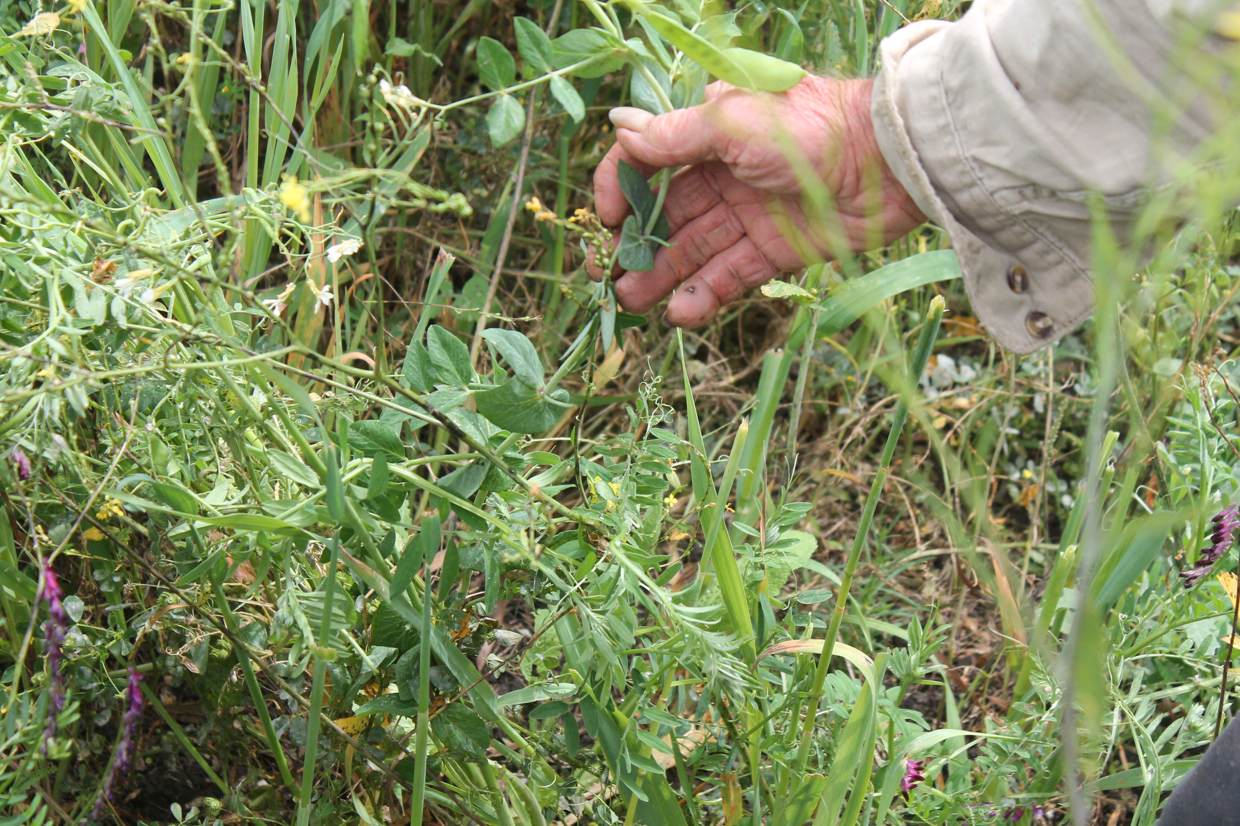 As he walks through one of his paddocks where high flowery plants and legumes are growing, these multi-species with a variety of plant roots feed the soil micro-organisms, which enhances soil carbon and overall soil health. It reduces water logging in the ground and it serves as feed for livestock.