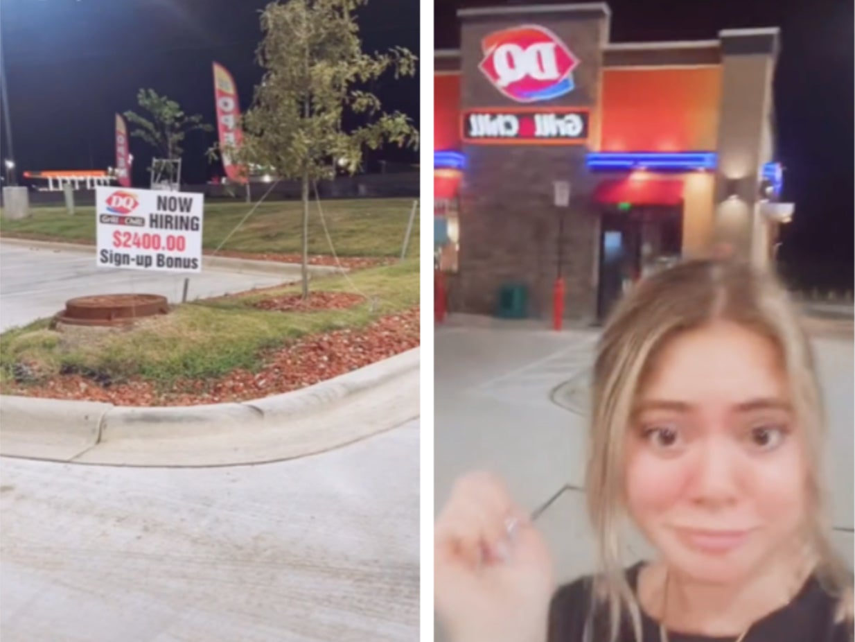 In a TikTok that has racked up half a million views, @randa_lauryn’s viral clip shows an American fast-food chain advertising a substantial bonus – simply for signing up. The Dairy Queen sign claims to offer $2,400 to new starters. ‘Now hiring – $2400 sign-up bonus’, the ad read.