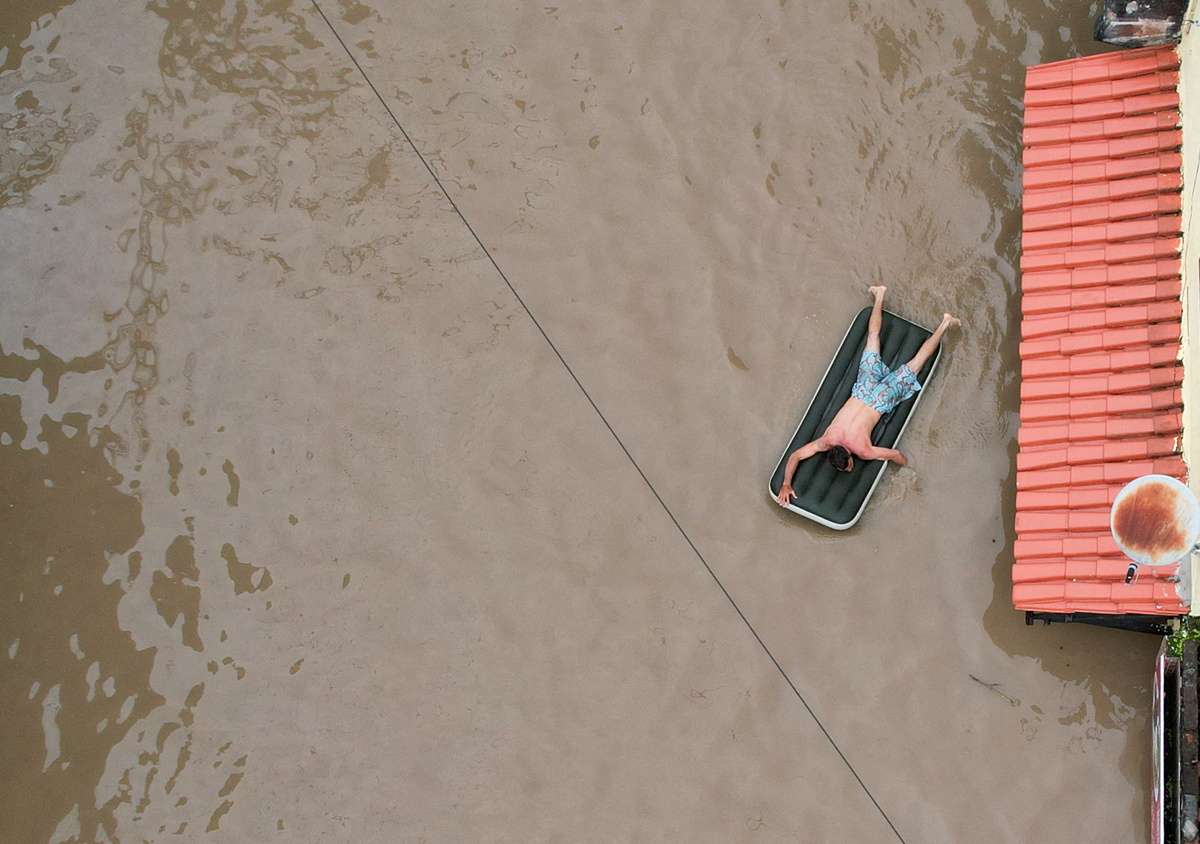 Rescuers rowed dinghies along flooded streets to reach trapped families or take them supplies. One man paddled on an inflatable mattress to reach a home.