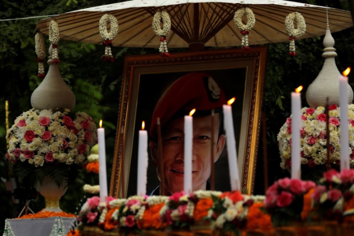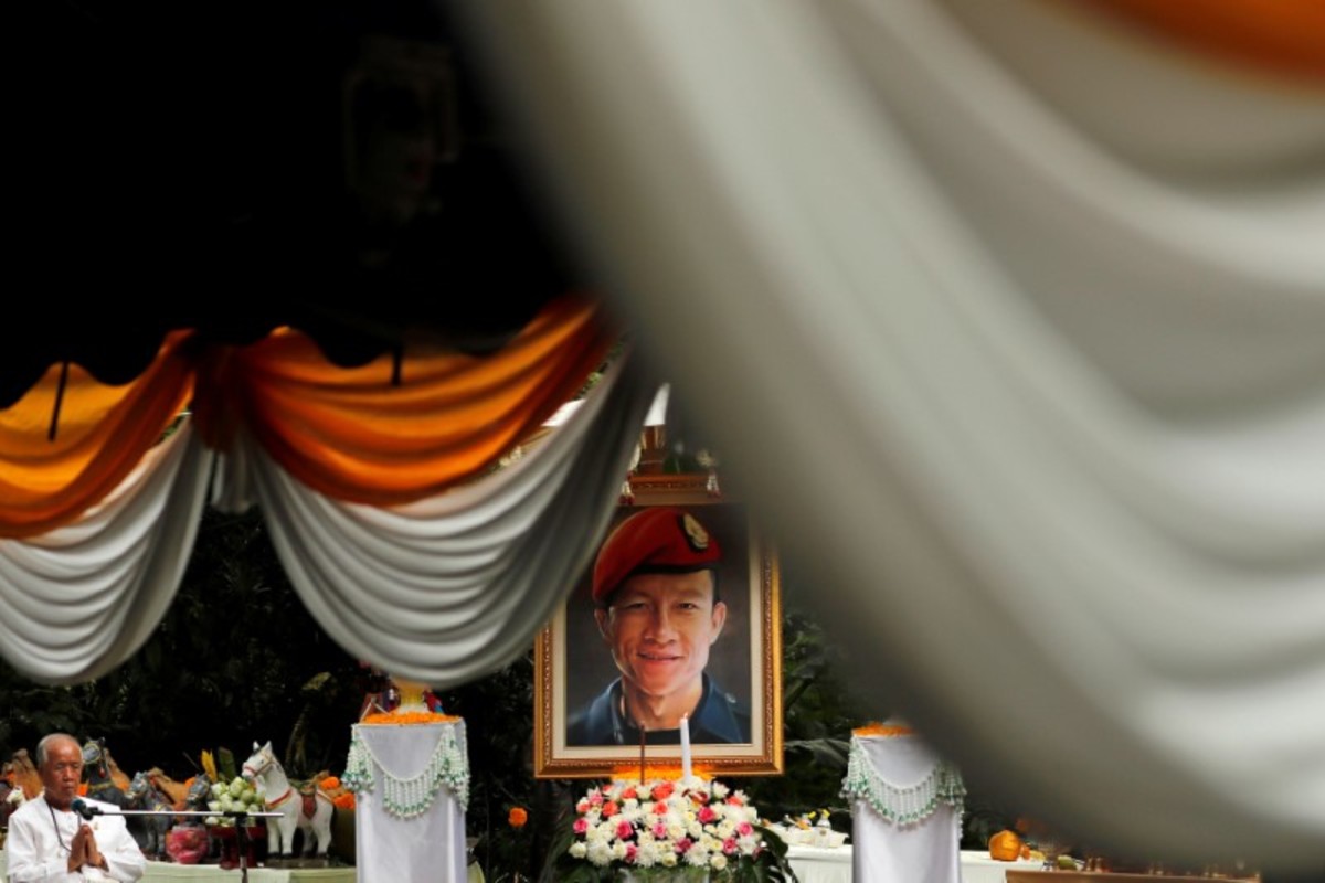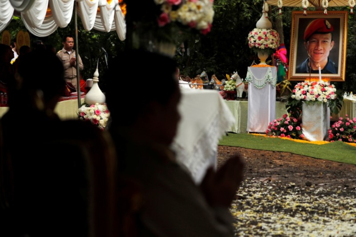 Soldiers attend the funeral a former Thai navy diver, Samarn Kunan, who died during the rescue mission for the 12 boys of the "Wild Boars" soccer team and their coach, near the Tham Luang cave complex, in the northern province of Chiang Rai, Thailand July 16, 2018. REUTERS/Tyrone SiuMourners attend the funeral of a former Thai navy diver, Samarn Kunan, who died during the rescue mission for the 12 boys of the "Wild Boars" soccer team and their coach, near the Tham Luang cave complex, in the northern province of Chiang Rai, Thailand July 16, 2018. REUTERS/Tyrone SiuOfferings are place during the funeral a former Thai navy diver, Samarn Kunan, who died during the rescue mission for the 12 boys of the "Wild Boars" soccer team and their coach, near the Tham Luang cave complex, in the northern province of Chiang Rai, Thailand July 16, 2018. REUTERS/Tyrone SiuPortrait of a former Thai navy diver, Samarn Kunan, who died during the rescue mission for the 12 boys of the "Wild Boars" soccer team and their coach, near the Tham Luang cave complex, is seen in the funeral, in the northern province of Chiang Rai, Thailand July 16, 2018. REUTERS/Tyrone SiuPortrait of a former Thai navy diver, Samarn Kunan, who died during the rescue mission for the 12 boys of the "Wild Boars" soccer team and their coach, near the Tham Luang cave complex, is seen in the funeral, in the northern province of Chiang Rai, Thailand July 16, 2018. REUTERS/Tyrone SiuPolice stand guard outside the Tham Luang cave complex, after the rescue mission for the 12 boys of the "Wild Boars" soccer team and their coach, in the northern province of Chiang Rai, Thailand July 16, 2018. REUTERS/Tyrone SiuA volunteer pray during the funeral a former Thai navy diver, Samarn Kunan, who died during the rescue mission for the 12 boys of the "Wild Boars" soccer team and their coach, outside the Tham Luang cave complex, in the northern province of Chiang Rai, Thailand July 16, 2018. REUTERS/Tyrone SiuMourners attend the funeral of a former Thai navy diver, Samarn Kunan, who died during the rescue mission for the 12 boys of the "Wild Boars" soccer team and their coach, near the Tham Luang cave complex, in the northern province of Chiang Rai, Thailand July 16, 2018. REUTERS/Tyrone Siu