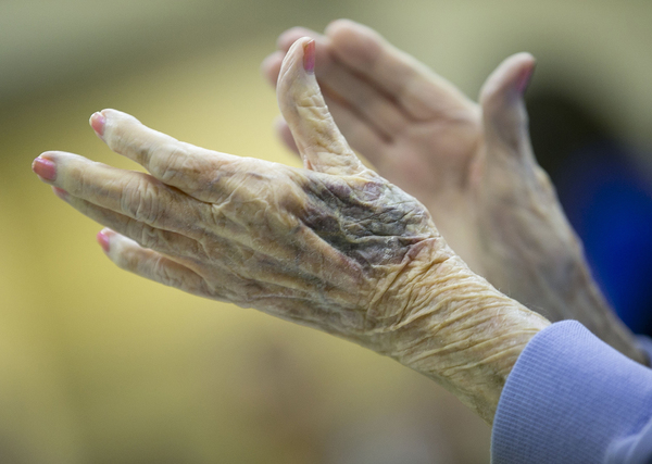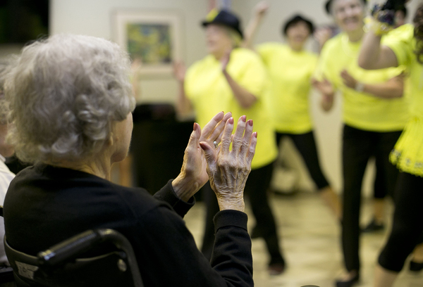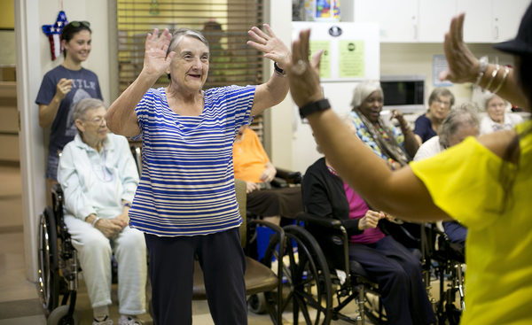 And she did. She joined in dancing as the music moved on to more interactive songs, like the Macarena and the Chicken Dance. Other residents, many of them in wheelchairs, joined in by twisting their torsos and moving their arms, all while laughing.