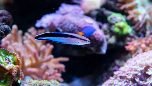 Diving among the coral reefs of the Indo-Pacific — the geographic region comprising the Indian Ocean and the west Pacific Ocean — you might see a bluestreak cleaner wrasse, which is a highly intelligent species and perhaps the first fish to show self-awareness. This wrasse relies on cleaning parasites from clients to find the majority of its diet.