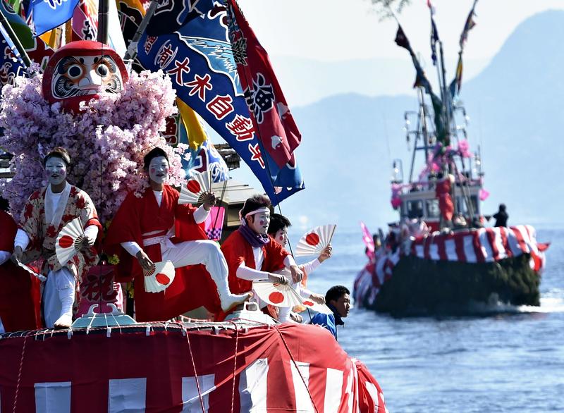 Fisherman adorned in female kimono and makeup dance on a ship decorated with Japanese cedar leaves and red and white banners off the coast of Numazu, Shizuoka Prefecture, on Thursday. The dance is part of a festival for Ose Shrine to pray for safety at sea and a bountiful catch, and is said to have first been performed to appease ocean deities.