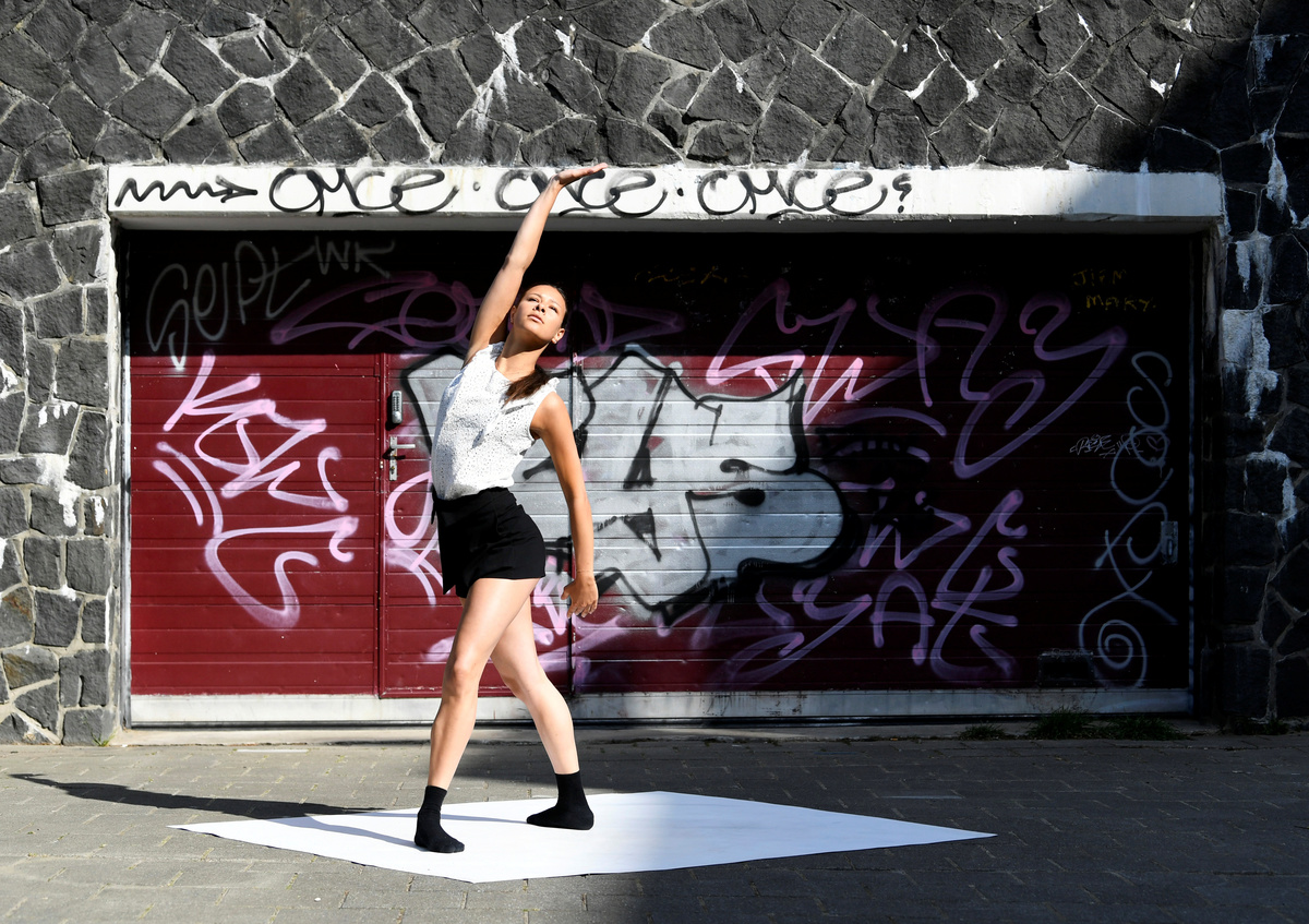 Ballet dancer Yvonne Slingerland Cosialls of the Dutch National Ballet performs on the streets of Amsterdam for the "Gently Quiet" project, amid the coronavirus disease (COVID-19) outbreak, in Amsterdam, the Netherlands April 24, 2020. REUTERS/Piroschka van de Wouw