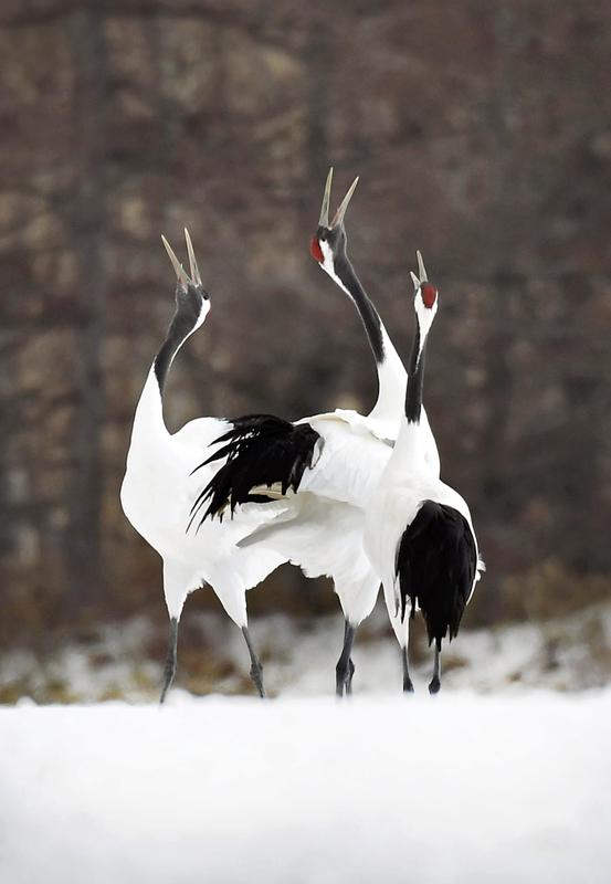 Japanese cranes, or tancho, are seen in all their majesty in the village of Tsurui in Hokkaido. The red-crowned birds -- designated a special national treasure -- called out and ate at a feeding ground of the Wild Bird Society of Japan's Tsurui-Ito Tancho Sanctuary in the village.
