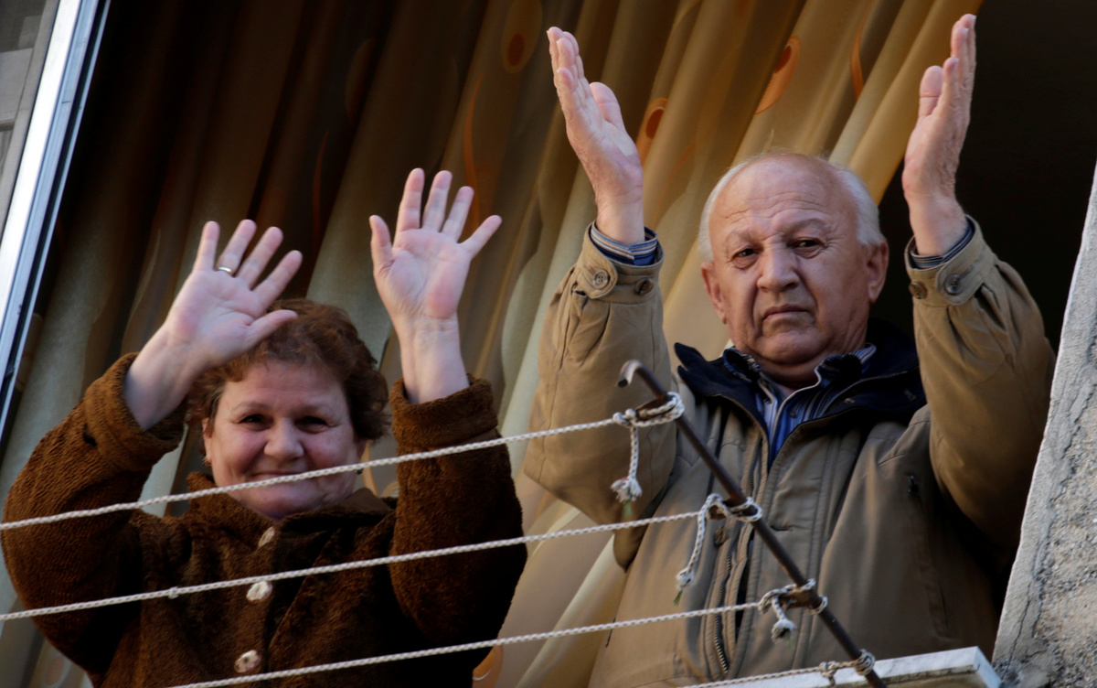 Tuesday evening's concert, the fifth so far, lasted 90 minutes, with singers mostly wearing face masks, taking turns belting out traditional songs into a microphone wrapped in plastic. Residents clapped their hands in rubber gloves. A few bent the rules to venture out and dance on the street near their doorsteps.