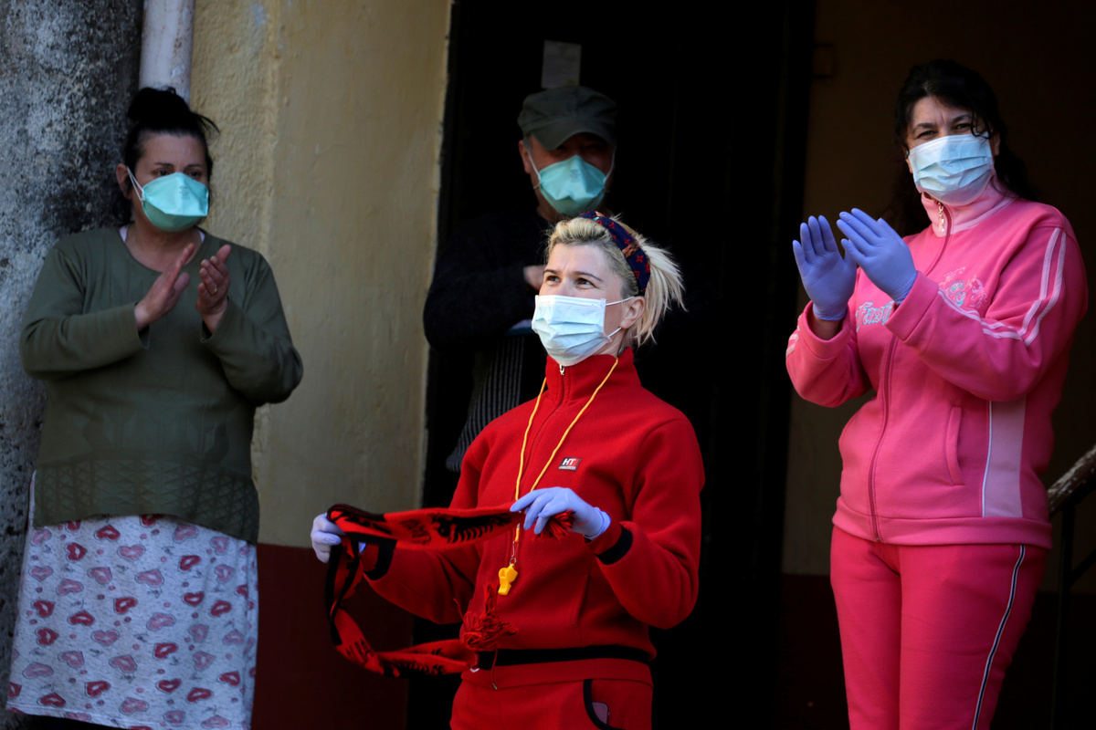 Each evening before sunset they go to a different neighbourhood in Albania's main port city, accompanied by a police escort and loudspeakers, to perform an impromptu concert to families shut inside the surrounding apartment buildings.