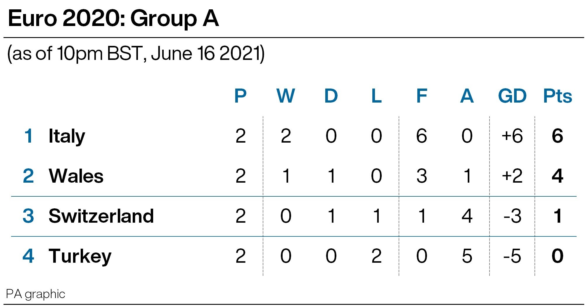 Italy, however, top Group A ahead of meeting Wales in Rome on Sunday, and have already qualified for the knockout phase after back-to-back 3-0 wins over Turkey and Switzerland