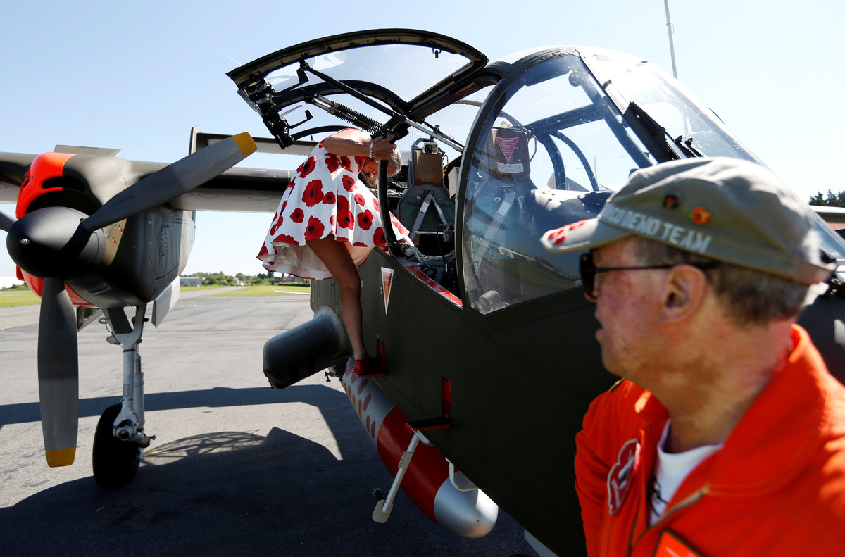 A hostess of the Bronco demo team boards an OV-10 Bronco aircraft, decorated with World War One commemoration motifs, at Flanders international airport, ahead of the world's first Short Take Off & Landing competition on sand, in Wevelgem, Belgium May 8, 2018. REUTERS/Francois Lenoir