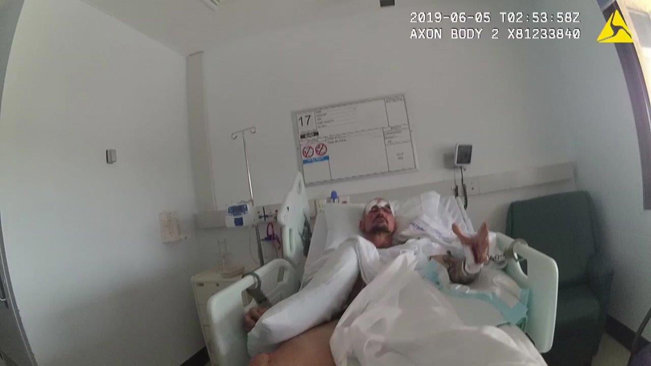 His bodyworn camera captures him calmly coaxing the killer out of the car before tactical police officers tasered Hoffmann to the ground.